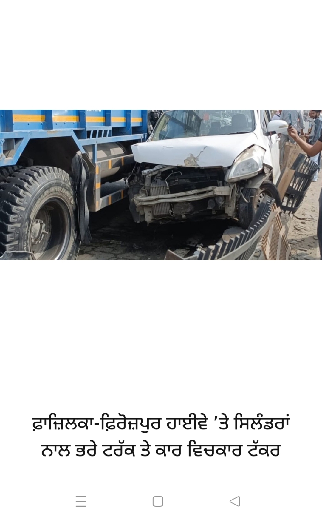 ਫਾਜ਼ਿਲਕਾ-ਫਿਰੋਜ਼ਪੁਰ ਹਾਈਵੇ ’ਤੇ ਸਥਿਤ ਬਬਲੂ ਇਨਕਲੇਵ ਨੇੜੇ ਅੱਜ ਸਵੇਰੇ ਕਰੀਬ 10 ਵਜੇ ਸਿਲੰਡਰਾਂ ਨਾਲ ਭਰੇ ਇਕ ਟਰੱਕ ਅਤੇ ਕਾਰ ਵਿਚਕਾਰ ਟੱਕਰ ਹੋ ਗਈ, ਜਿਸ ਦੌਰਾਨ ਵੱਡਾ ਜਾਨੀ ਨੁਕਸਾਨ