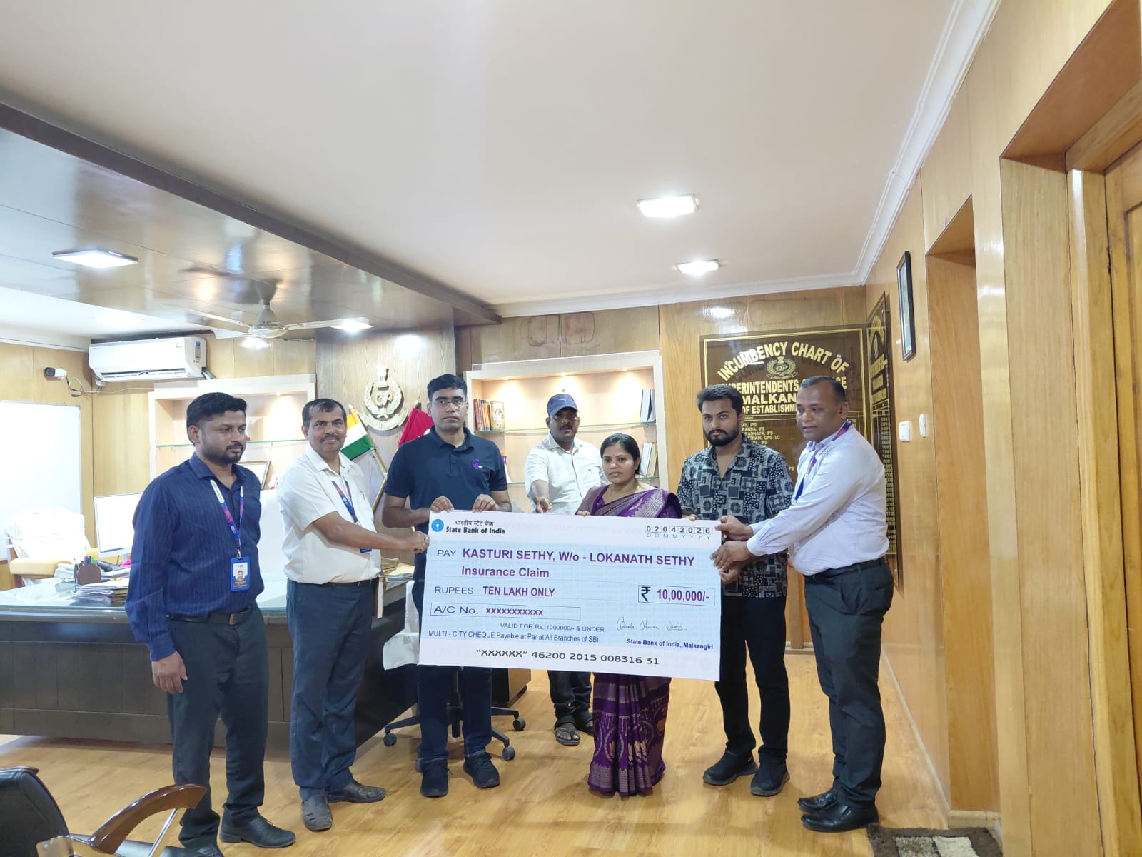ମାଲକାନଗିରି ଭାରତୀୟ ଷ୍ଟେଟ ବ୍ୟାଙ୍କ ମୁଖ୍ୟ ଶାଖା ତରଫରୁ ଆରକ୍ଷୀ ଅଧିକ୍ଷକ କାର୍ଯ୍ୟାଳୟ ରେ 10 ଲକ୍ଷ ଟଙ୍କା ର cheque ପ୍ରଦାନ କରା ଯାଇଛି. ଏହି ଉତ୍ସବ ରେ ମୁଖ୍ୟ ଅତିଥି ରୂପେ ଆରକ୍ଷୀ ଅଧୀକ୍ଷକ ବିନୋଦ ପାଟିଲ H, ଶ୍ରୀମତୀ କସ୍ତୁରୀ ସେଠି ସ୍ୱାମୀ ସ୍ବର୍ଗତ ଲୋକନାଥ ସେଠି କୁ ପ୍ରଦାନ କରିଥିଲେ.