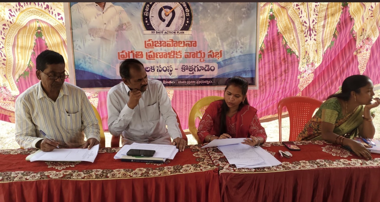 కొత్తగూడెం ఏప్రిల్ 2 తెలంగాణ రాష్ట్ర ప్రభుత్వం ప్రారంభించిన ప్రజా పాలన- ప్రగతి ప్రణాళిక 99 రోజుల యాక్షన్ ప్లాన్) కార్యక్రమంలో భాగంగా కొత్తగూడెం శాసనసభ్యులు కునంనేని సాంబశివరావు ఆదేశాల మేరకు గురువారం 11వ డివిజన్ పాత కొత్తగూడెం లో స్థానిక కార్పొరేటర్ ఆకాంక్ష పడాల ఆధ్వర్యంలో వార్డ్ సభ నిర్వహించడం జరిగింది.ఈ సభను తెలంగాణ రాష్ట్ర గీతంతో ప్రారంభించి గత రెండున్నర సంవత్సరాల కాలంలో రాష్ట్ర ప్రభుత్వం చేపట్టిన కార్యక్రమాలను, సంక్షేమ పథకాలను అభివృద్ధి పనులను రాష్ట్ర ముఖ్యమంత్రి ఇచిన సందేశాన్ని వివరించి, స్థానిక ప్రజలచే అభిప్రాయాలు,వార్డ్ సమస్యలను చర్చించి పలు అంశాలను తీర్మానించి మినిట్స్ బుక్ లో రాసుకోవడం జరిగింది. ఈ యొక్క కార్యక్రమంలో స్పెషల్ ఆఫీసర్ రవి కుమార్ , వార్డ్ ఆఫీసర్ ఎన్ రవి , ఆర్ పి అనురాధ , డివిజన్ పెద్దలు పడాల భవాని ప్రసాద్, మహిళలు యూత్ సభ్యులు అధిక సంఖ్యలో పాల్గొన్నారు.