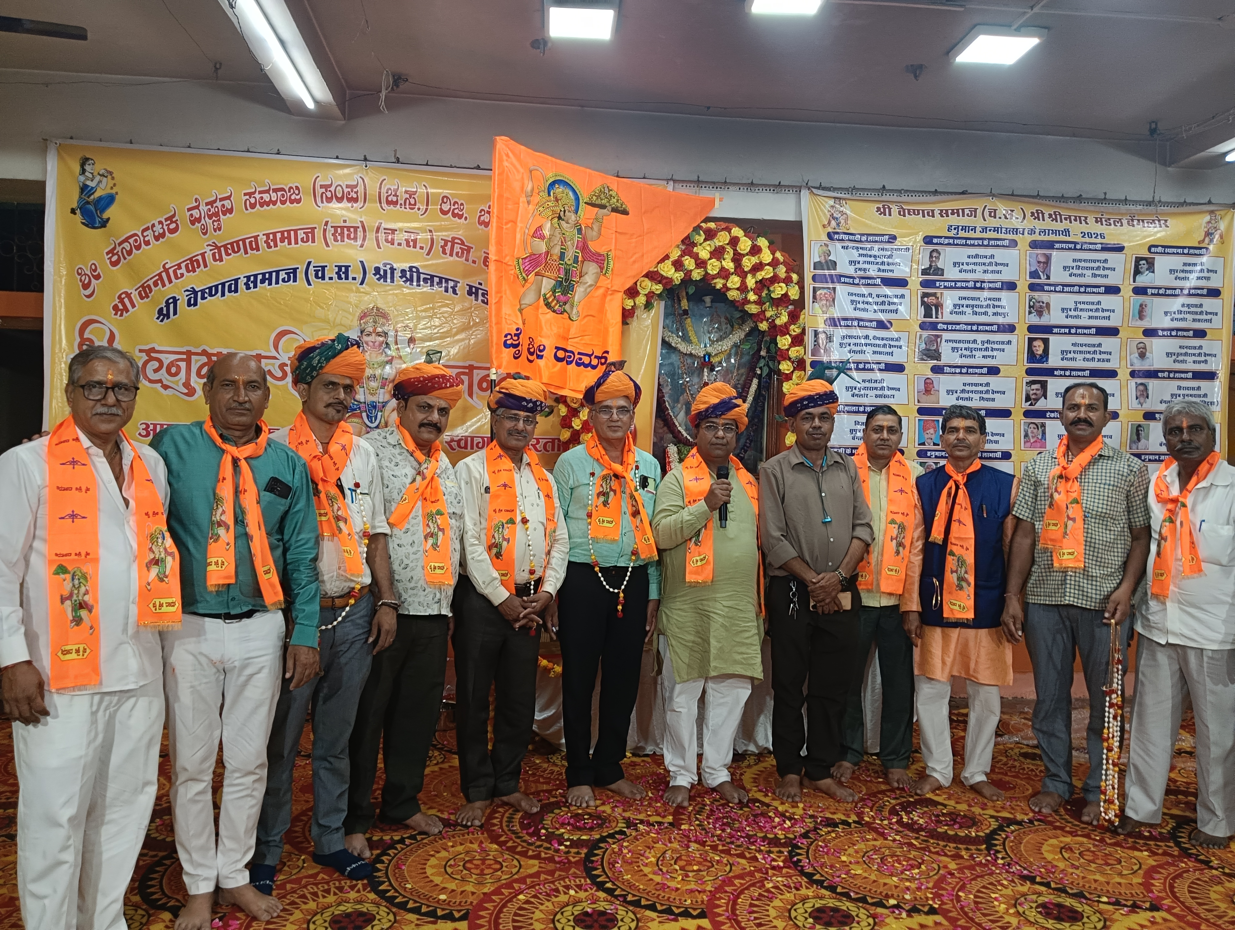 बेंगलुरु (दलपतसिंह भायल)। हनुमान जयंती के पावन अवसर पर श्री कर्नाटक वैष्णव समाज संघ के सानिध्य में श्री वैष्णव समाज (च.सं.) श्री श्रीनगर मंडल द्वारा आयोजित श्री हनुमान जन्मोत्सव अत्यंत श्रद्धा, भक्ति और हर्षोल्लास के साथ भव्य रूप से सम्पन्न हुआ। इस धार्मिक आयोजन में शहर के विभिन्न क्षेत्रों से बड़ी संख्या में श्रद्धालु, समाजबंधु एवं भक्तजन उपस्थित हुए और भगवान हनुमान के चरणों में अपनी आस्था अर्पित की।
