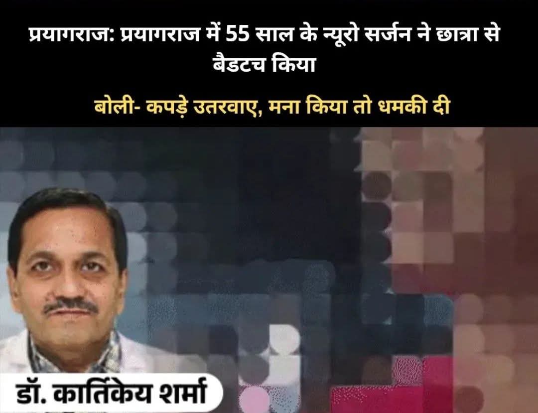 #प्रयागराज से दीपक पटेल : प्रयागराज के जाने-माने न्यूरो सर्जन डॉ. कार्तिकेय शर्मा पर गुरुवार को बैडटच की FIR दर्ज की गई है। BA की छात्रा ने उन पर छेड़खानी का आरोप लगाया है। उसका कहना है कि डॉक्टर ने जबरन उसके कपड़े उतरवाए। फिर गंदी नीयत से छुआ। सिविल लाइंस पुलिस ने छात्रा की शिकायत पर मुकदमा दर्ज कर लिया। छात्रा को मेडिकल के लिए भेजा गया है।
