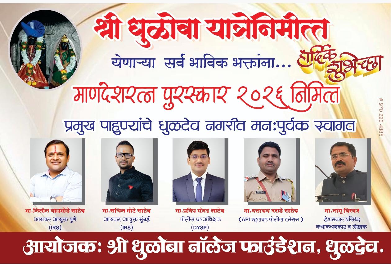 माण तालुक्यातील धुळदेव येथे सुरू असलेल्या श्री धुळोबा देवाच्या यात्रेला यंदा विशेष महत्त्व प्राप्त झाले असून, ‘माणदेश रत्न पुरस्कार सोहळा’ हा या यात्रेचा मुख्य आकर्षण ठरत आहे. विशेष म्हणजे, माणदेशातील कोहिनूर हिरे म्हणून ओळखले जाणारे आयकर आयुक्त मा. सचिन मोटे आणि आयकर आयुक्त नितीन वाघमोडे यांच्या प्रमुख उपस्थितीत हा भव्य सोहळा पार पडणार आहे.