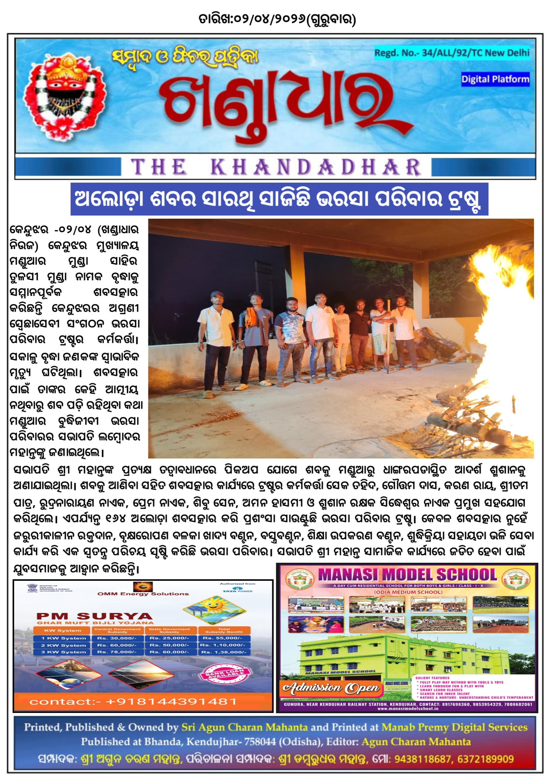 କେନ୍ଦୁଝର -୦୨/୦୪(ଖଣ୍ଡାଧାର ନିଉଜ) କେନ୍ଦୁଝର ମୁଖ୍ୟାଳୟ ମଣ୍ଡୁଆର ମୁଣ୍ଡା ସାହିର ତୁଳସୀ ମୁଣ୍ଡା ନାମକ ବୃଦ୍ଧାକୁ ସମ୍ମାନପୂର୍ବକ ଶବସତ୍କାର କରିଛନ୍ତି କେନ୍ଦୁଝରର ଅଗ୍ରଣୀ ସ୍ବେଛାସେବୀ ସଂଗଠନ ଭରସା ପରିବାର ଟ୍ରଷ୍ଟର କର୍ମକର୍ତ୍ତା। ସକାଳୁ ବୃଦ୍ଧା ଜଣକଙ୍କ ସ୍ୱାଭାବିକ ମୃତ୍ୟୁ ଘଟିଥିଲା। ଶବସତ୍କାର ପାଇଁ ତାଙ୍କର କେହି ଆତ୍ମୀୟ ନଥିବାରୁ ଶବ ପଡ଼ି ରହିଥିବା କଥା ମଣ୍ଡୁଆର ବୁଦ୍ଧିଜୀବୀ ଭରସା ପରିବାରର ସଭାପତି ଲମ୍ବୋଦର ମହାନ୍ତଙ୍କୁ ଜଣାଇଥିଲେ। ସଭାପତି ଶ୍ରୀ ମହାନ୍ତଙ୍କ ପ୍ରତ୍ୟକ୍ଷ ତତ୍ୱାବଧାନରେ ପିକଅପ ଯୋଗେ ଶବକୁ ମଣ୍ଡୁଆରୁ ଧାଙ୍ଗରପଡାସ୍ଥିତ ଆଦର୍ଶ ଶ୍ମଶାନକୁ ଅଣାଯାଇଥିଲା। ଶବକୁ ଆଣିବା ସହିତ ଶବସତ୍କାର କାର୍ଯ୍ୟରେ ଟ୍ରଷ୍ଟର କର୍ମକର୍ତ୍ତା ସେକ ତହିଦ, ଗୌତ୍ତମ ଦାସ, କରଣ ରାୟ, ଶ୍ରୀତମ ପାତ୍ର, ରୁଦ୍ରନାରାୟଣ ନାଏକ, ପ୍ରେମ ନାଏକ, ଶିବୁ ସେନ, ଅମନ ହାସମୀ ଓ ଶ୍ମଶାନ ରକ୍ଷକ ସିଦ୍ଧେଶ୍ୱର ନାଏକ ପ୍ରମୁଖ ସହଯୋଗ କରିଥିଲେ। ଏପର୍ଯ୍ୟନ୍ତ ୧୬୪ ଅଲୋଡ଼ା ଶବସତ୍କାର କରି ପ୍ରଶଂସା ସାଉଣ୍ଟୁଛି ଭରସା ପରିବାର ଟ୍ରଷ୍ଟ। କେବଳ ଶବସତ୍କାର ନୁହେଁ ଜରୁରୀକାଳୀନ ରକ୍ତଦାନ, ବୃକ୍ଷରୋପଣ ବଳକା ଖାଦ୍ୟ ବଣ୍ଟନ, ବସ୍ତ୍ରବଣ୍ଟନ, ଶିକ୍ଷା ଉପକରଣ ବଣ୍ଟନ, ଶୁଦ୍ଧିକ୍ରିୟା ସହାୟତା ଭଳି ସେବା କାର୍ଯ୍ୟ କରି ଏକ ସ୍ୱତନ୍ତ୍ର ପରିଚୟ ସୃଷ୍ଟି କରିଛି ଭରସା ପରିବାର। ସଭାପତି ଶ୍ରୀ ମହାନ୍ତ ସାମାଜିକ କାର୍ଯ୍ୟରେ ଜଡିତ ହେବା ପାଇଁ ଯୁବସମାଜକୁ ଆହ୍ୱାନ କରିଛନ୍ତି।