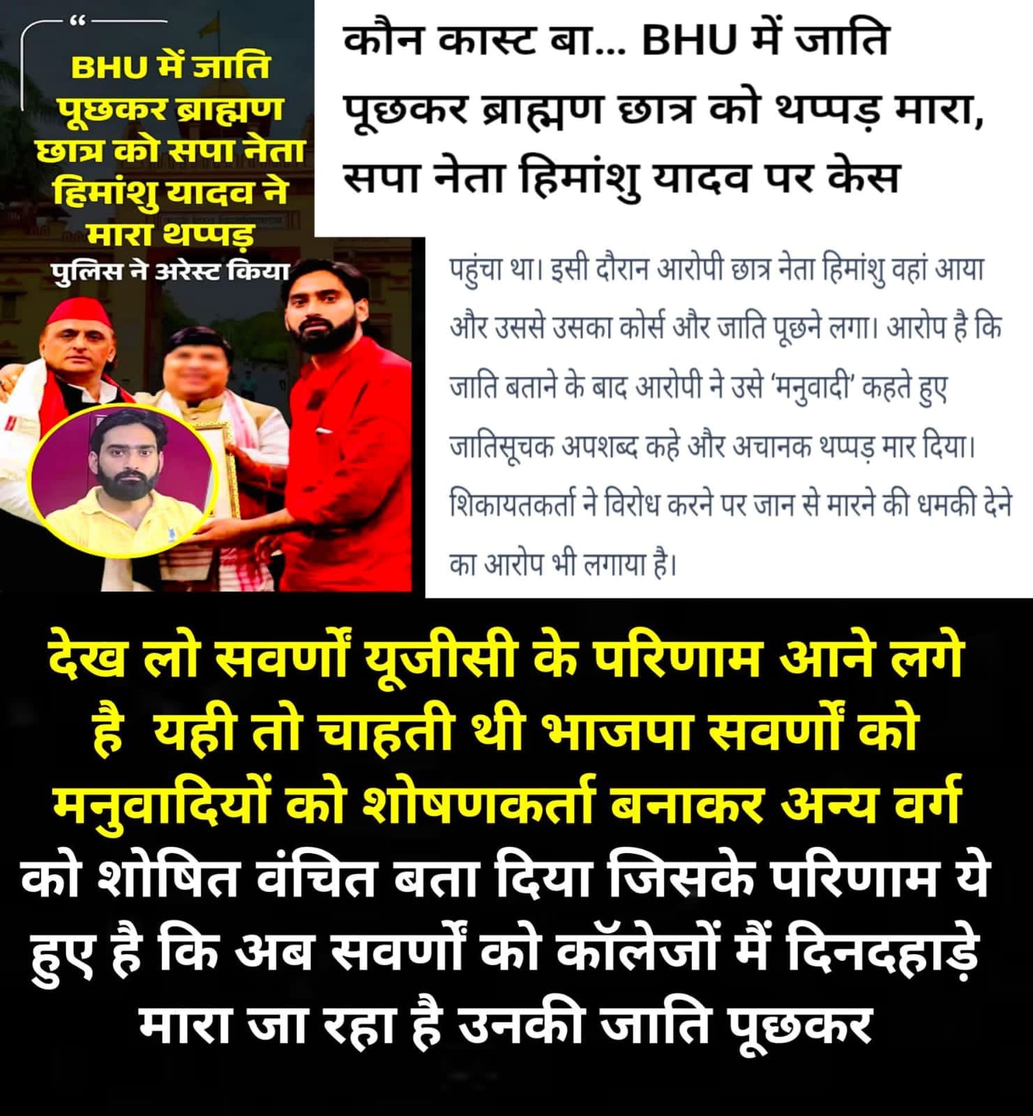 सवर्णों को अब कॉलेजों मै उनकी जाति पूछकर मारा जाने लगा है यूजीसी के परिणाम आने लगे है यही तो चाहती थी भाजपा यही बदला लिया जा रहा है अब बेचारे सवर्ण लेकिन अब भी भाजपा और अन्य पार्टीयो का झंडा उठाकर घूमेंगे स्वयं के समाज की स्थिति कहा पहुंच चुकी है उसे नजरंदाज करके