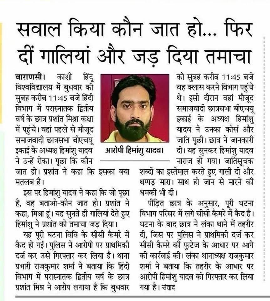 काशी हिंदू विश्वविद्यालय (BHU) के कैंपस में एक स्टूडेंट के साथ जाति पूछकर मारपीट का मामला सामने आया है. मारपीट की ये घटना हिंदी विभाग के MA द्वितीय वर्ष के छात्र प्रशांत मिश्रा के साथ हुई है.पीड़ित छात्र का आरोप है कि हमलावरों ने पहले उससे उसकी जाति पूछी. जैसे ही उसने अपना नाम बताया उन पर हमला कर दिया गया. इस घटना के बाद कैंपस में छात्रों के बीच भारी आक्रोश है.फिलहाल इस मामले में पुलिस ने समाजवादी छात्र सभा के बीएचयू इकाई अध्यक्ष को गिरफ्तार कर लिया है.