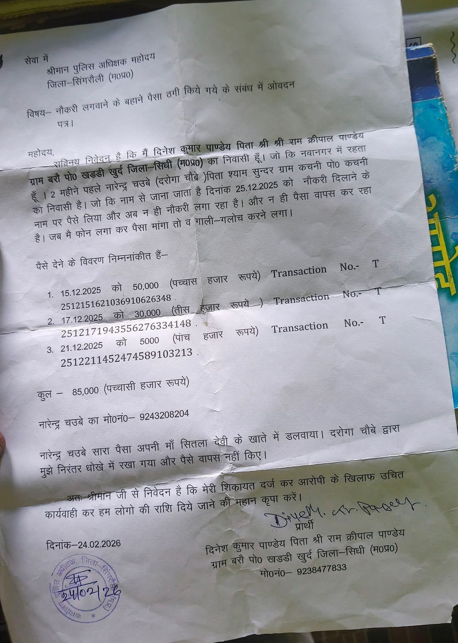 सिंगरौली में भाजपा नेता विनोद चौबे के भाई नरेंद्र चौबे (उर्फ दरोगा चौबे) पर नौकरी दिलाने के नाम पर ₹85,000 की ठगी करने का गंभीर आरोप लगा है। पीड़ित दिनेश कुमार पाण्डेय ने इस संबंध में पुलिस अधीक्षक (SP), सिंगरौली को शिकायत पत्र सौंपा है।