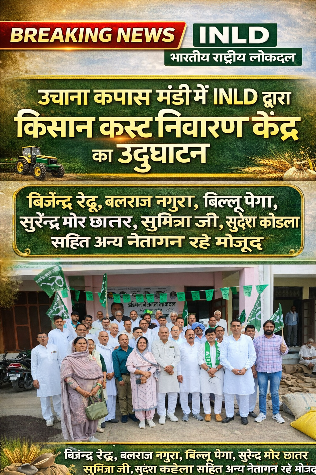 उचाना कपास मंडी में आज इंडियन नेशनल लोकदल (INLD) द्वारा किसान कष्ट निवारण केंद्र का विधिवत उद्घाटन किया गया। यह केंद्र दुकान नंबर 64 पर स्थापित किया गया है, जिसका उद्देश्य क्षेत्र के किसानों की समस्याओं का समाधान करना और उन्हें उचित मार्गदर्शन प्रदान करना है।