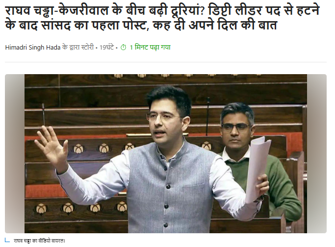 आम आदमी पार्टी के नेता राघव चड्ढा को राज्यसभा में पार्टी के उपनेता पद से हटाकर अशोक मित्तल को नियुक्त किया गया है, जबकि शीर्ष नेतृत्व के साथ उनके मतभेद की अटकलें तेज हैं।