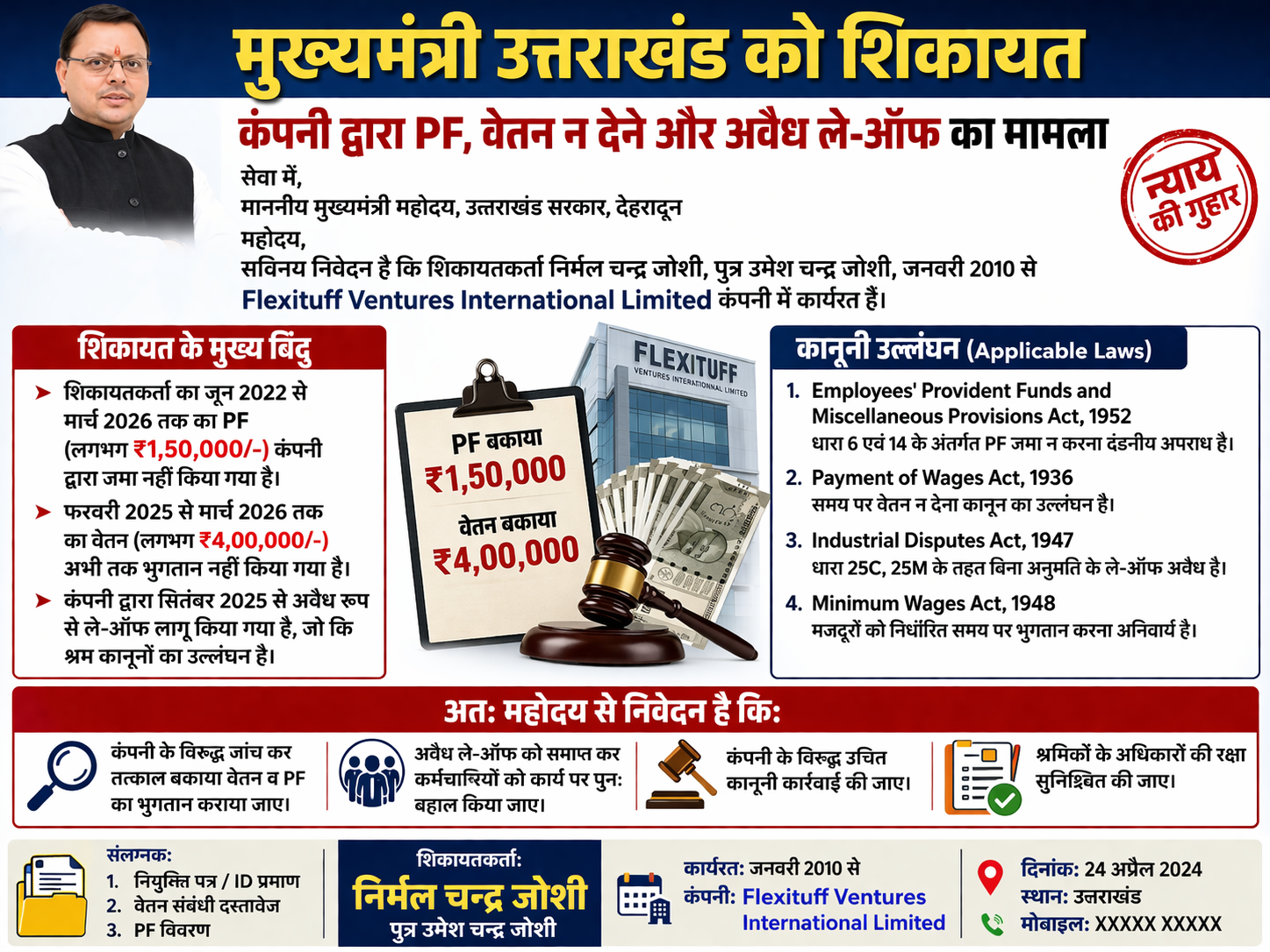 उत्तराखंड में श्रमिकों के अधिकारों को लेकर एक गंभीर मामला सामने आया है, जहां Flexituff Ventures International Limited कंपनी पर अपने कर्मचारी का लाखों रुपये बकाया रखने का आरोप लगा है।
