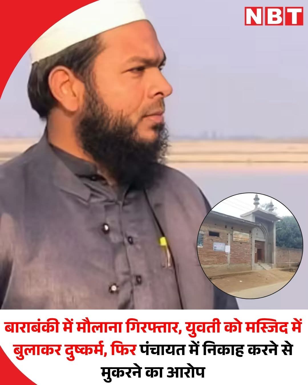 उत्तर प्रदेश के बाराबंकी में एक मदरसे के मौलाना ने युवती को मस्जिद में बुलाकर दुष्कर्म किया। पीड़िता का आरोप है कि 3 मार्च को हुई घटना में गांव के कुछ युवकों ने वीडियो बना लिया था, जिसे मौलाना ने धमका कर डिलीट करा दिया। मामले को दबाने के लिए मौलाना और उसके परिवार के लोगों ने निकाह करने का आश्वासन दिया, लेकिन पंचायत में वह निकाह करने से मुकर गया। 31 मार्च को युवती की शिकायत पर पुलिस ने मुकदमा दर्ज कर आरोपी मौलाना को गिरफ्तार कर जेल भेज दिया है।पुलिस के मुताबिक, मोहम्मदपुर खाला थाना क्षेत्र में एक मदरसे के मौलाना रेहान ने युवती को बड़ी मस्जिद में बुला कर दुष्कर्म की वारदात को अंजाम दिया। पीड़िता की शिकायत पर पुलिस ने एक्शन लेते हुए मुकदमा दर्ज कर आरोपी मौलाना रेहान को गिरफ्तार कर लिया है।