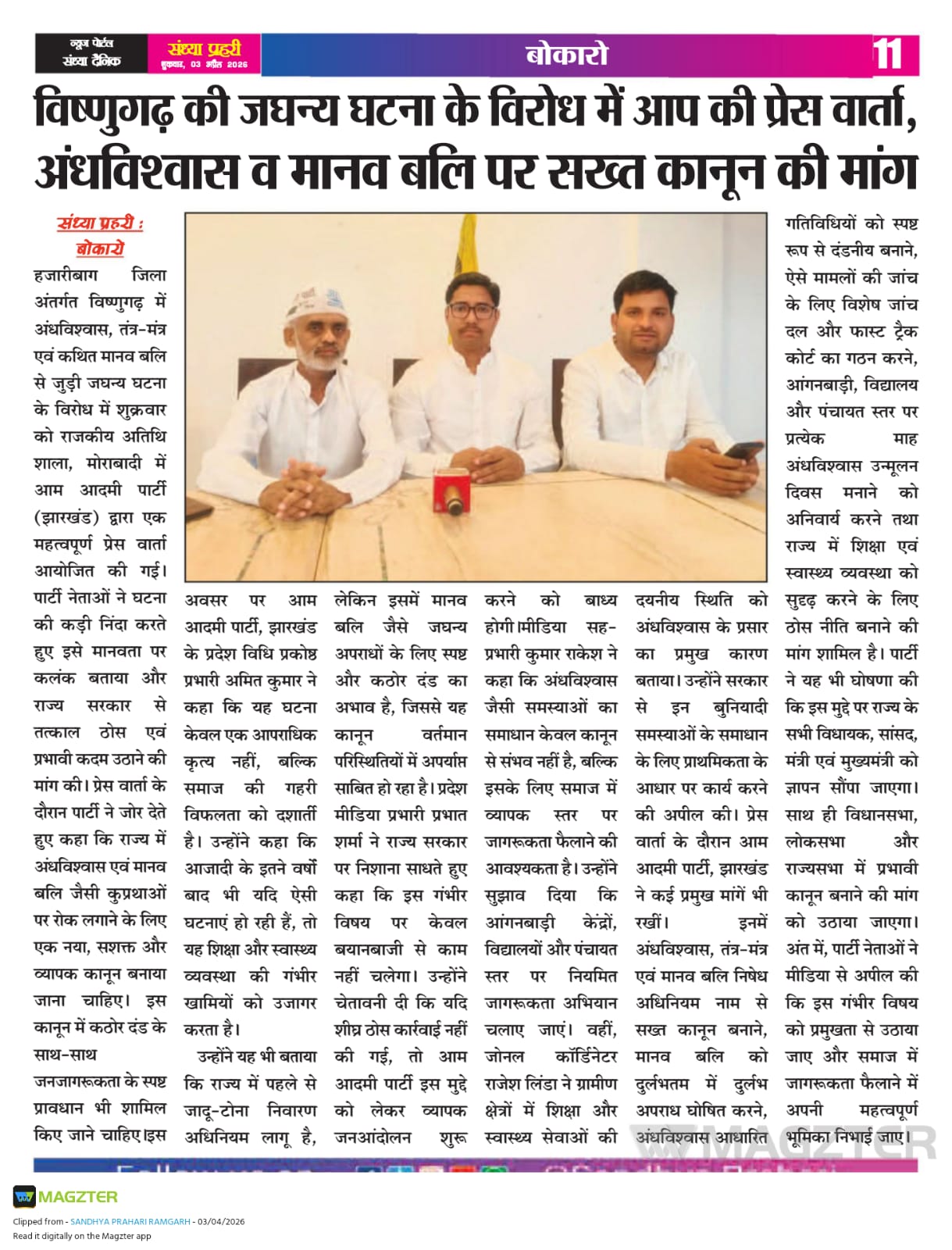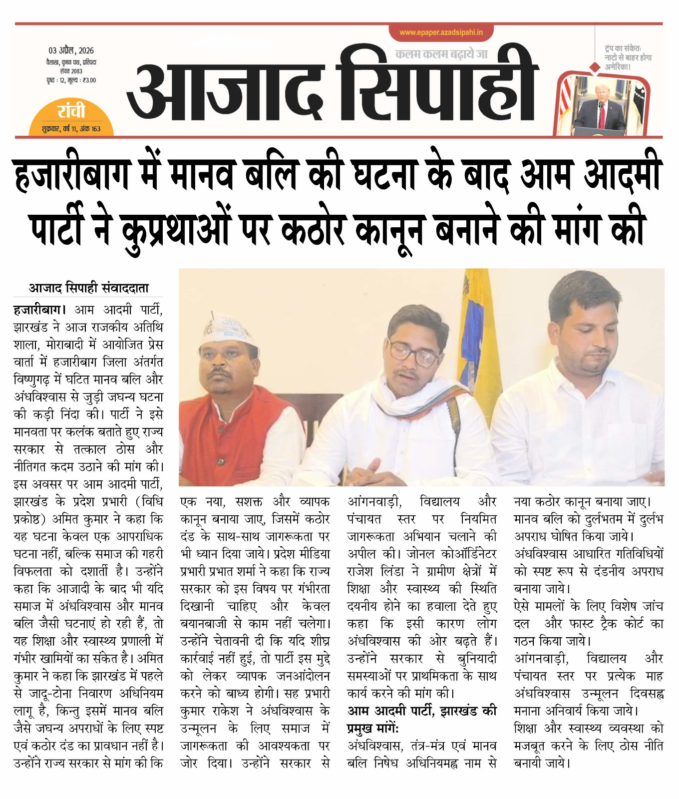शुक्रवार को राजकीय अतिथि शाला, मोराबादी में आम आदमी पार्टी झारखंड की प्रेस वार्ता में हजारीबाग जिला अंतर्गत विष्णुगढ़ में घटित अंधविश्वास, तंत्र-मंत्र एवं तथाकथित मानव बलि से जुड़ी जघन्य घटना की कड़ी निंदा की गई। पार्टी ने इस घटना को मानवता पर कलंक बताते हुए राज्य सरकार से तत्काल ठोस एवं नीतिगत कदम उठाने की मांग की। सरकार से मांग की गयी कि एक नया, सशक्त एवं व्यापक कानून बनाया जाए, जिसमें कठोर दंड के साथ-साथ जागरूकता का भी स्पष्ट प्रावधान हो।