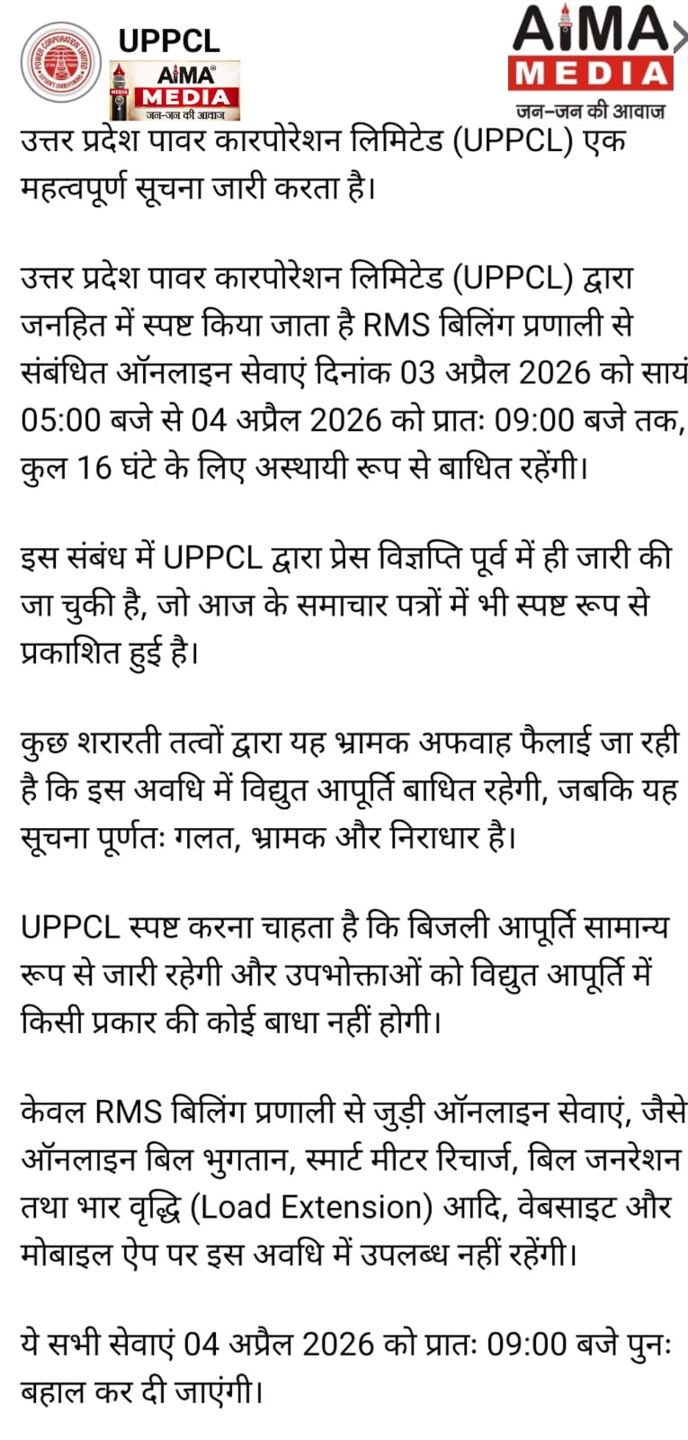 जारी सूचना के अनुसार, RMS बिलिंग सिस्टम से संबंधित ऑनलाइन सेवाएं 3 अप्रैल 2026 को शाम 5:00 बजे से 4 अप्रैल 2026 की सुबह 9:00 बजे तक, यानी कुल 16 घंटे के लिए बंद रहेंगी। इस दौरान उपभोक्ता ऑनलाइन बिल भुगतान, स्मार्ट मीटर रिचार्ज, बिल जनरेशन और लोड एक्सटेंशन जैसी सेवाओं का उपयोग नहीं कर पाएंगे।
