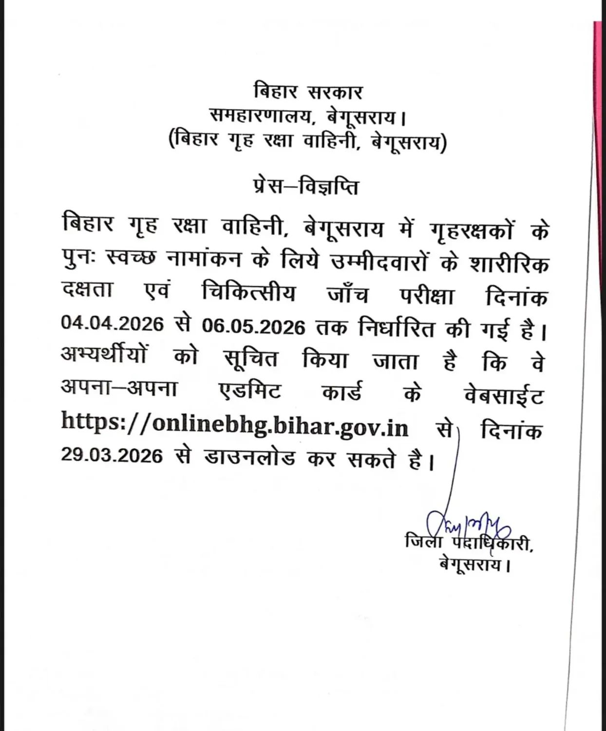 बिहार गृह रक्षा वाहिनी (Home Guard) बेगुसराय समाहरनालय के द्वारा प्रेस विज्ञपति जारी कर उम्मीदवारों को सूचना प्रेसित किया गया है कि बेगुसराय में गृह रक्षकों के पुनः स्वच्छ नामांकन के लिए उम्मीदवारों के शारीरिक दक्षता एवं चिकित्सीय जाँच परीक्षा दिनांक 04.04.2026 से 06.05.2026 तक ली जायेगी।