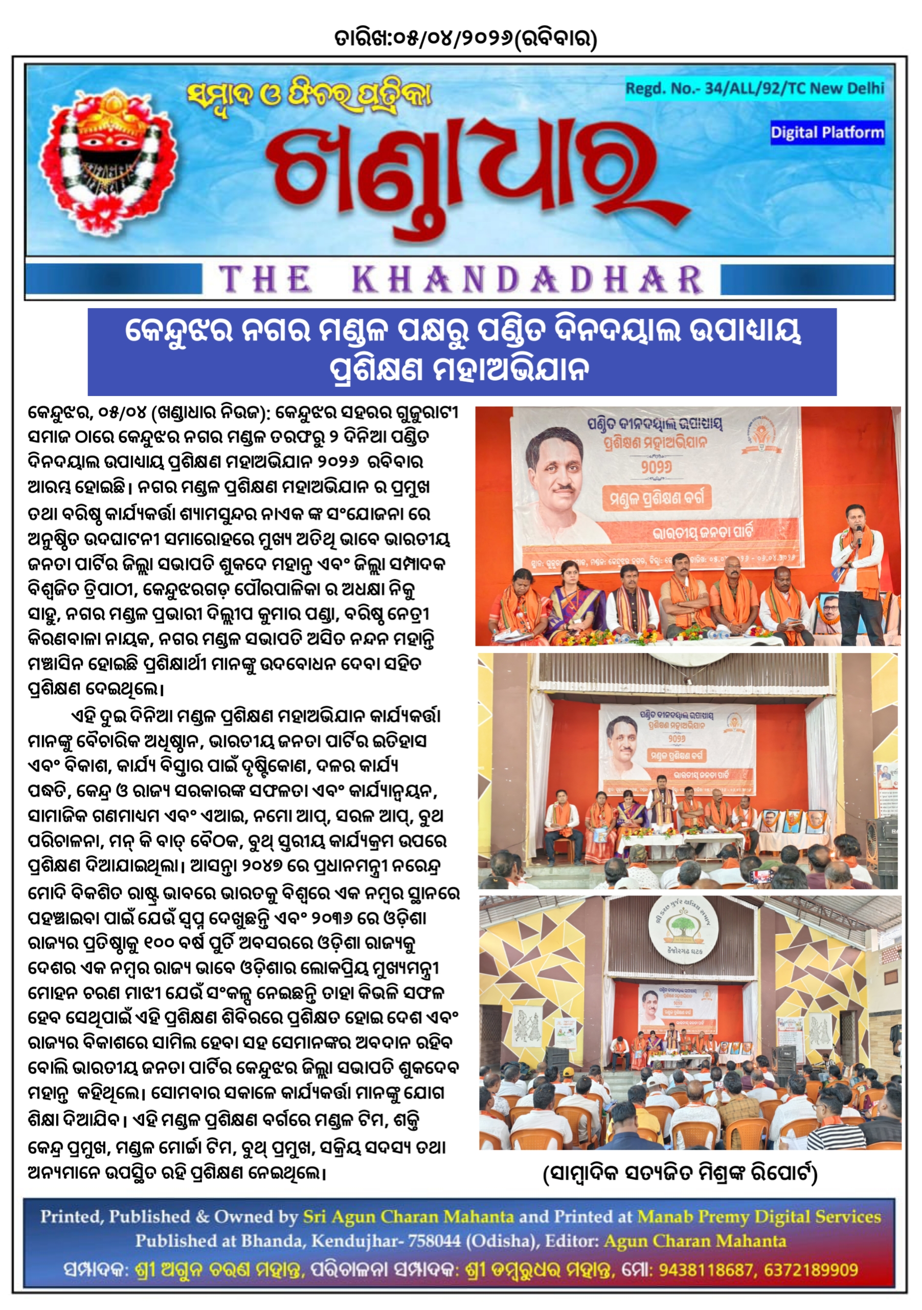 କେନ୍ଦୁଝର ନଗର ମଣ୍ଡଳ ପକ୍ଷରୁ ପଣ୍ଡିତ ଦିନଦୟାଲ ଉପାଧ୍ୟାୟ ପ୍ରଶିକ୍ଷଣ ମହାଅଭିଯାନ।