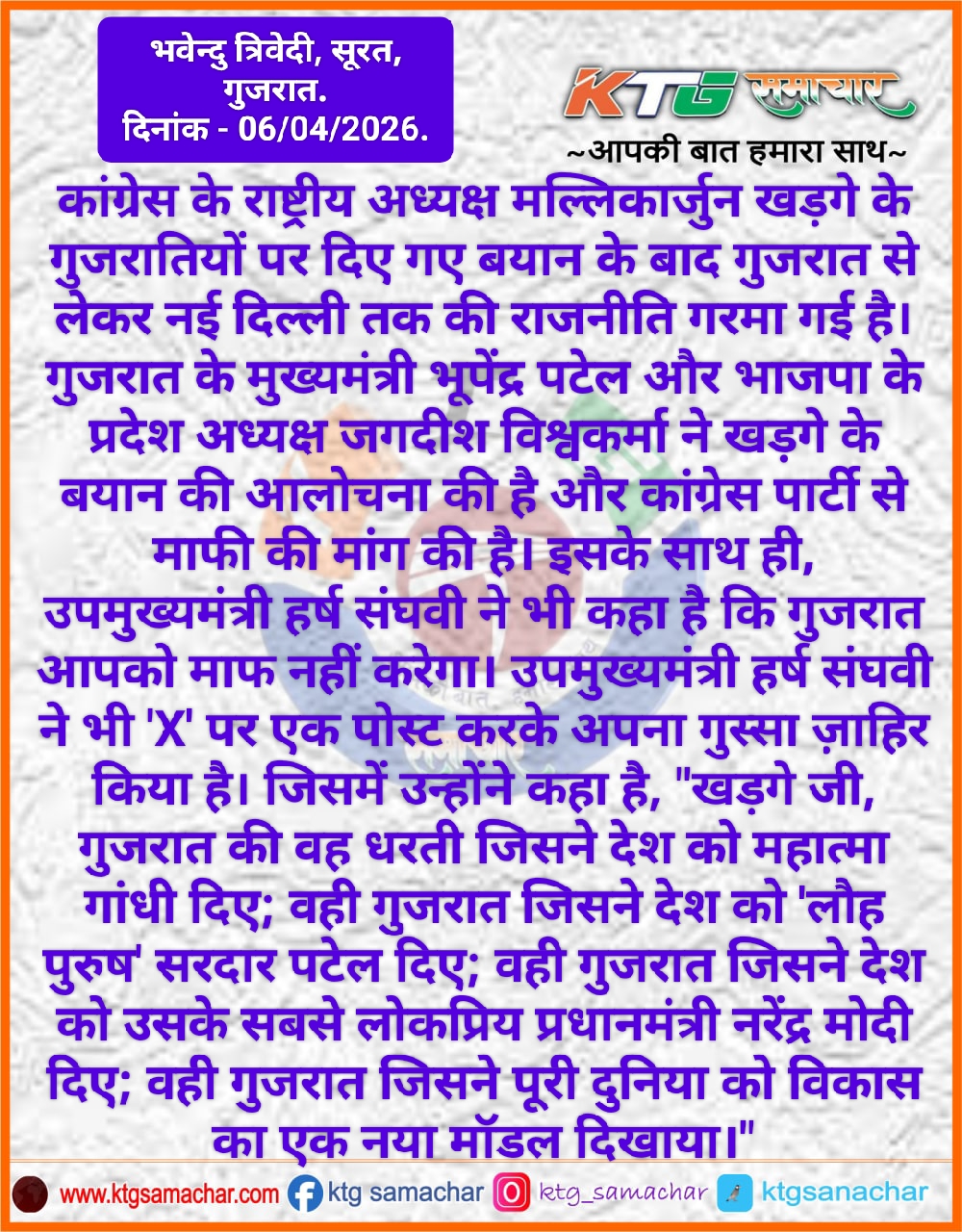उपमुख्यमंत्री हर्ष संघवी ने सोशल मीडिया पर एक पोस्ट में कांग्रेस अध्यक्ष खरगे पर तीखा हमला बोला और कहां की गुजरात की राजनीतिक रूप से जागरूक जनता में गांधी और पटेल की भूमि का अपमान करने वालों को हमेशा नकारा है और आगे भी ऐसा करती रहेगी। साथ ही कहा कि गुजरात इसे माफ नहीं करेगा।