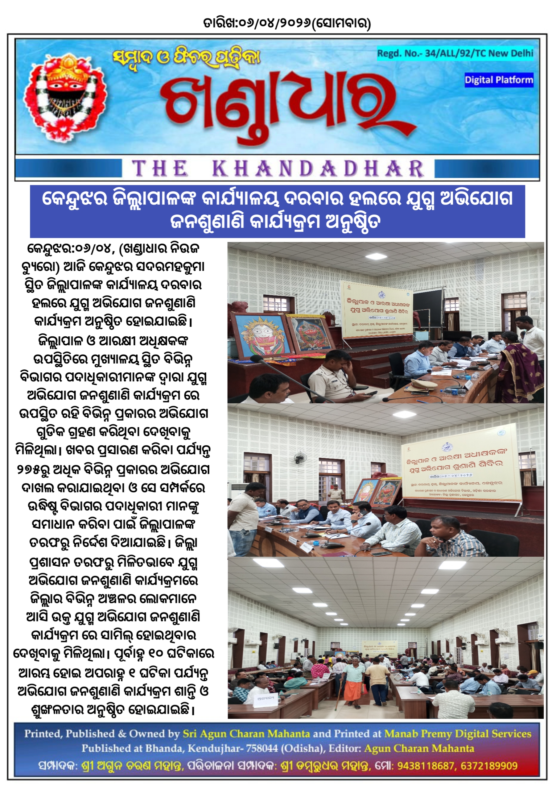 କେନ୍ଦୁଝର ଜିଲ୍ଲାପାଳଙ୍କ କାର୍ଯ୍ୟାଳୟ ଦରବାର ହଲରେ ଯୁଗ୍ମ ଅଭିଯୋଗ ଜନଶୁଣାଣି କାର୍ଯ୍ୟକ୍ରମ ଅନୁଷ୍ଠିତ।