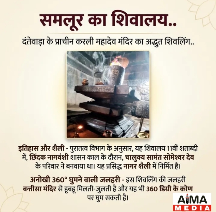 दंतेवाड़ा के समलूर में स्थित 11वीं सदी के प्राचीन करली महादेव मंदिर के दर्शन करें। नागर शैली में निर्मित इस मंदिर के अद्भुत शिवलिंग की जलहरी 360 डिग्री घूमती है, जो इसके अनूठे शिल्प का प्रमाण है। 🛕🙏