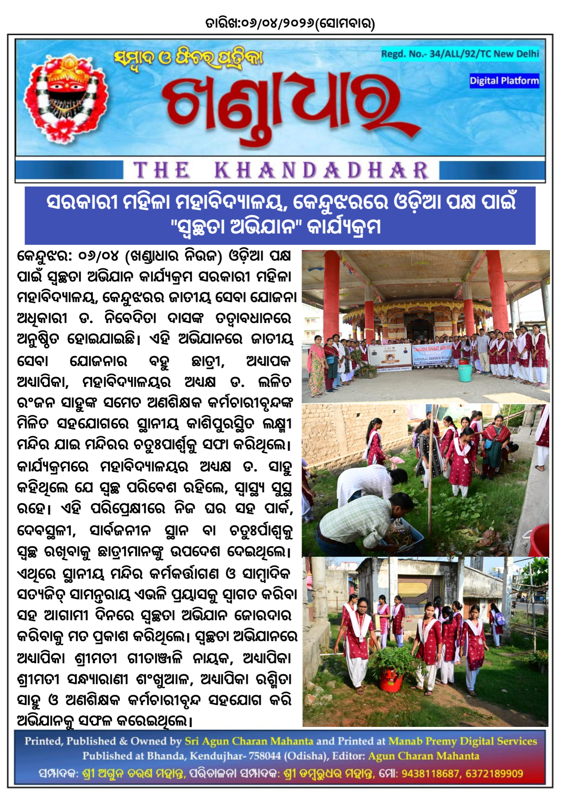 ସରକାରୀ ମହିଳା ମହାବିଦ୍ୟାଳୟ, କେନ୍ଦୁଝରରେ ଓଡ଼ିଆ ପକ୍ଷ ପାଇଁ "ସ୍ବଚ୍ଛତା ଅଭିଯାନ" କାର୍ଯ୍ୟକ୍ରମ।