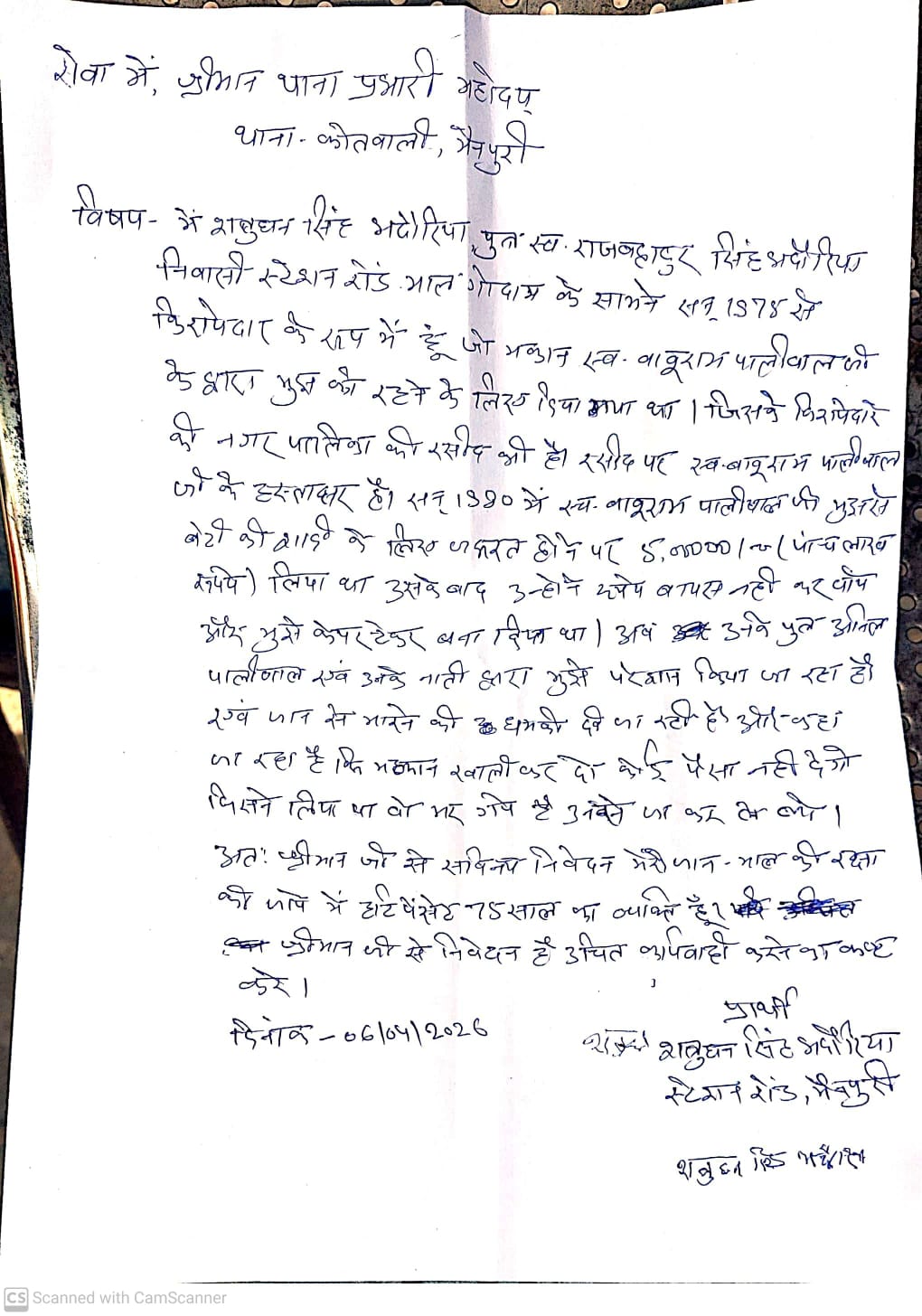 मैनपुरी। जनपद मैनपुरी में एक 75 वर्षीय बुजुर्ग किरायेदार के साथ उत्पीड़न और धमकी का गंभीर मामला सामने आया है। स्टेशन रोड, माल गोदाम के सामने रहने वाले शत्रुघ्न सिंह भदोरिया ने आरोप लगाया है कि उन्हें मकान से जबरन बेदखल करने के लिए लगातार दबाव बनाया जा रहा है तथा जान से मारने की धमकियां दी जा रही हैं।