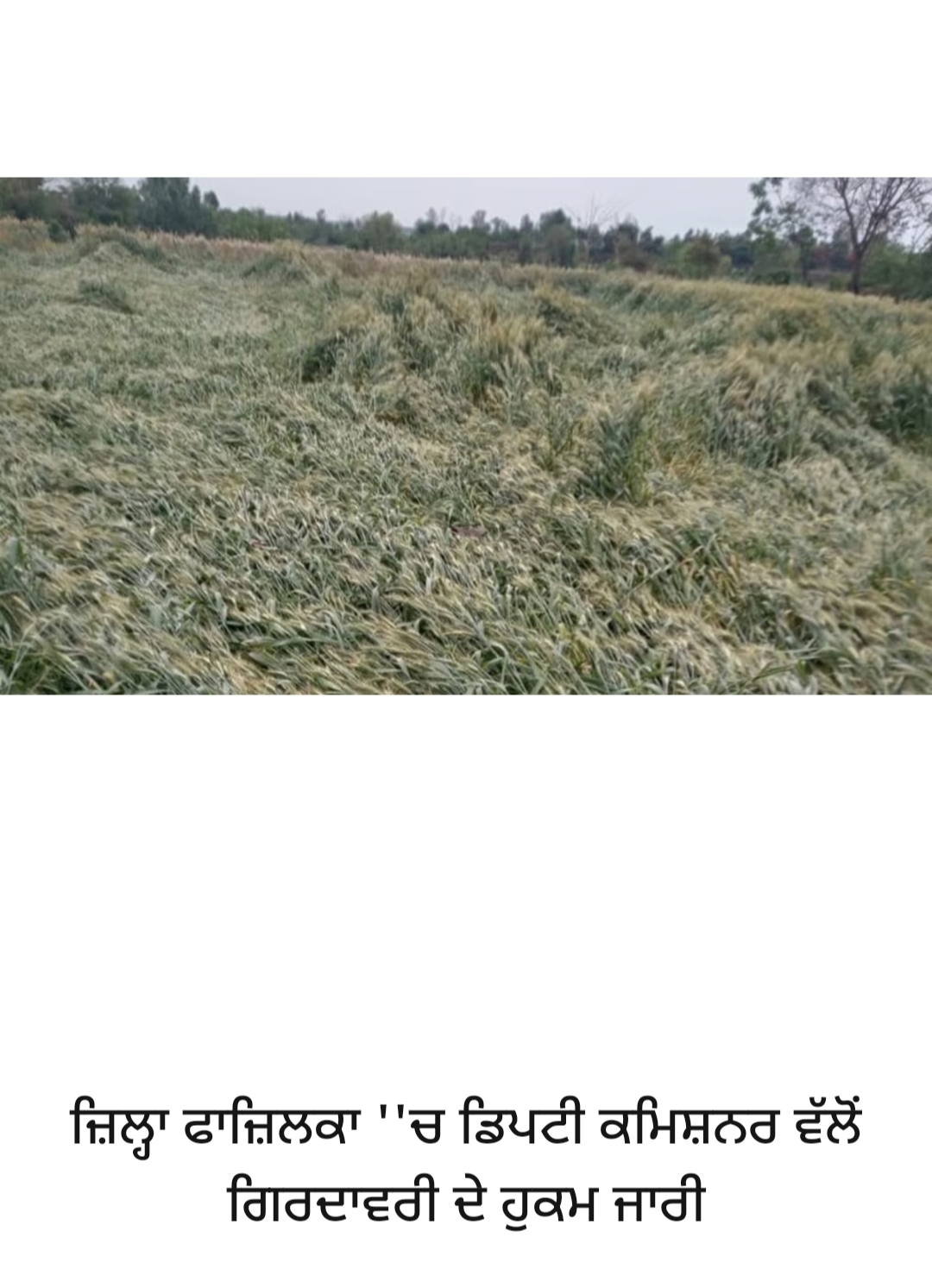 ਹਾਲ ਹੀ ਵਿੱਚ ਪਈ ਅਚਾਨਕ ਬਾਰਿਸ਼ ਨੇ ਇਲਾਕੇ ਵਿੱਚ ਕਣਕ ਦੀ ਫਸਲ ਨੂੰ ਭਾਰੀ ਨੁਕਸਾਨ ਪਹੁੰਚਾਇਆ ਹੈ। ਇਸ ਸਥਿਤੀ ਨੂੰ ਗੰਭੀਰਤਾ ਨਾਲ ਲੈਂਦਿਆਂ ਡਿਪਟੀ ਕਮਿਸ਼ਨਰ ਫਾਜ਼ਿਲਕਾ ਅਮਰਪ੍ਰੀਤ ਕੌਰ ਸੰਧੂ ਵੱਲੋਂ ਤੁਰੰਤ ਖਾਸ ਗਿਰਦਾਵਰੀ ਕਰਨ ਦੇ ਹੁਕਮ ਜਾਰੀ ਕੀਤੇ ਗਏ ਹਨ।