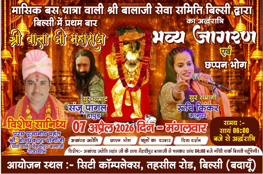 श्री बालाजी महाराज का भव्य जागरण-कीर्तन 7 अप्रैल को, ज्योति यात्रा से भक्तिमय होगा बिल्सी नगर
