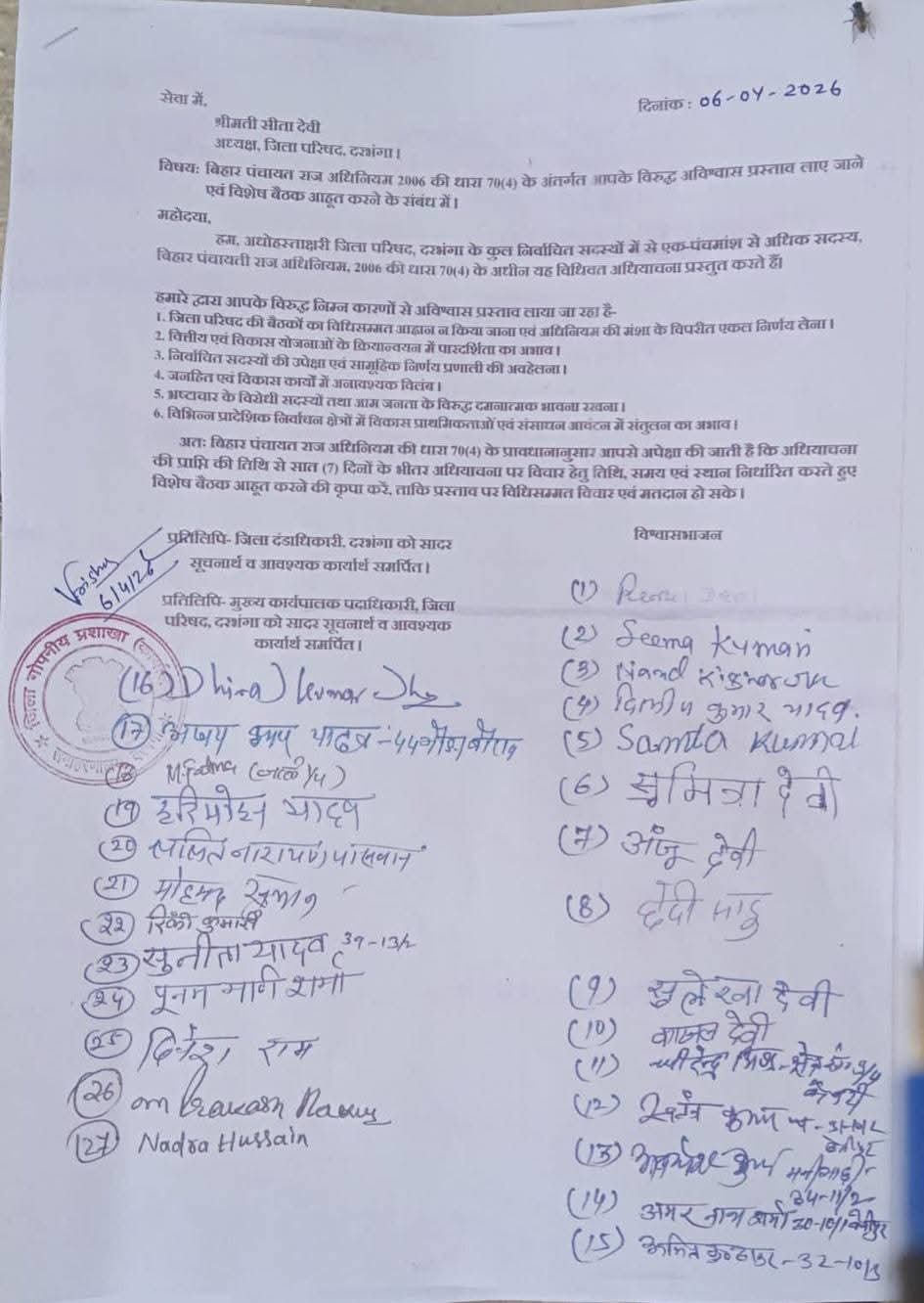 दरभंगा जिला परिषद में बगावत! 27 पार्षदों ने अध्यक्ष सीता देवी के खिलाफ ठोका अविश्वास प्रस्ताव