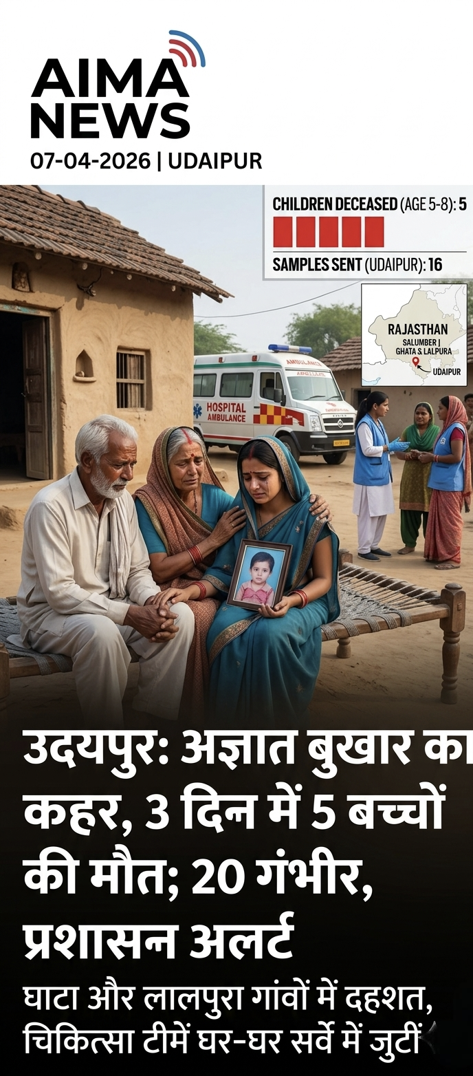 अजमेर/सलूंबर | 07 अप्रैल, 2026 राजस्थान के नवगठित सलूंबर जिले से एक दिल दहला देने वाली खबर सामने आ रही है। जिले के लसाड़िया उपखंड में अज्ञात बुखार ने कोहराम मचा रखा है। पिछले मात्र तीन दिनों के भीतर 5 बच्चों की मौत हो चुकी है, जिससे पूरे क्षेत्र में दहशत और शोक का माहौल है। प्रशासन अब हरकत में आया है और प्रभावित गांवों में मेडिकल इमरजेंसी जैसी स्थिति बनी हुई है।