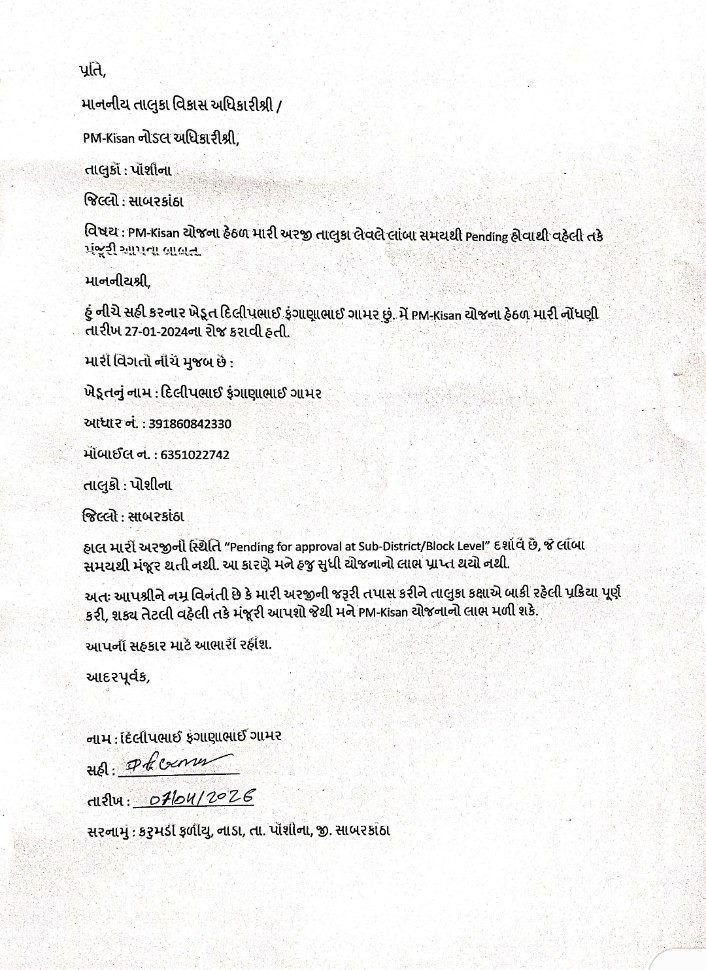 વિષય : PM-Kisan યોજના હેઠળ મારી અરજી તાલુકા લેવલે લાંબા સમયથી Pending હોવાથી વહેલી તકે મંજૂરી આપવા બાબત.
