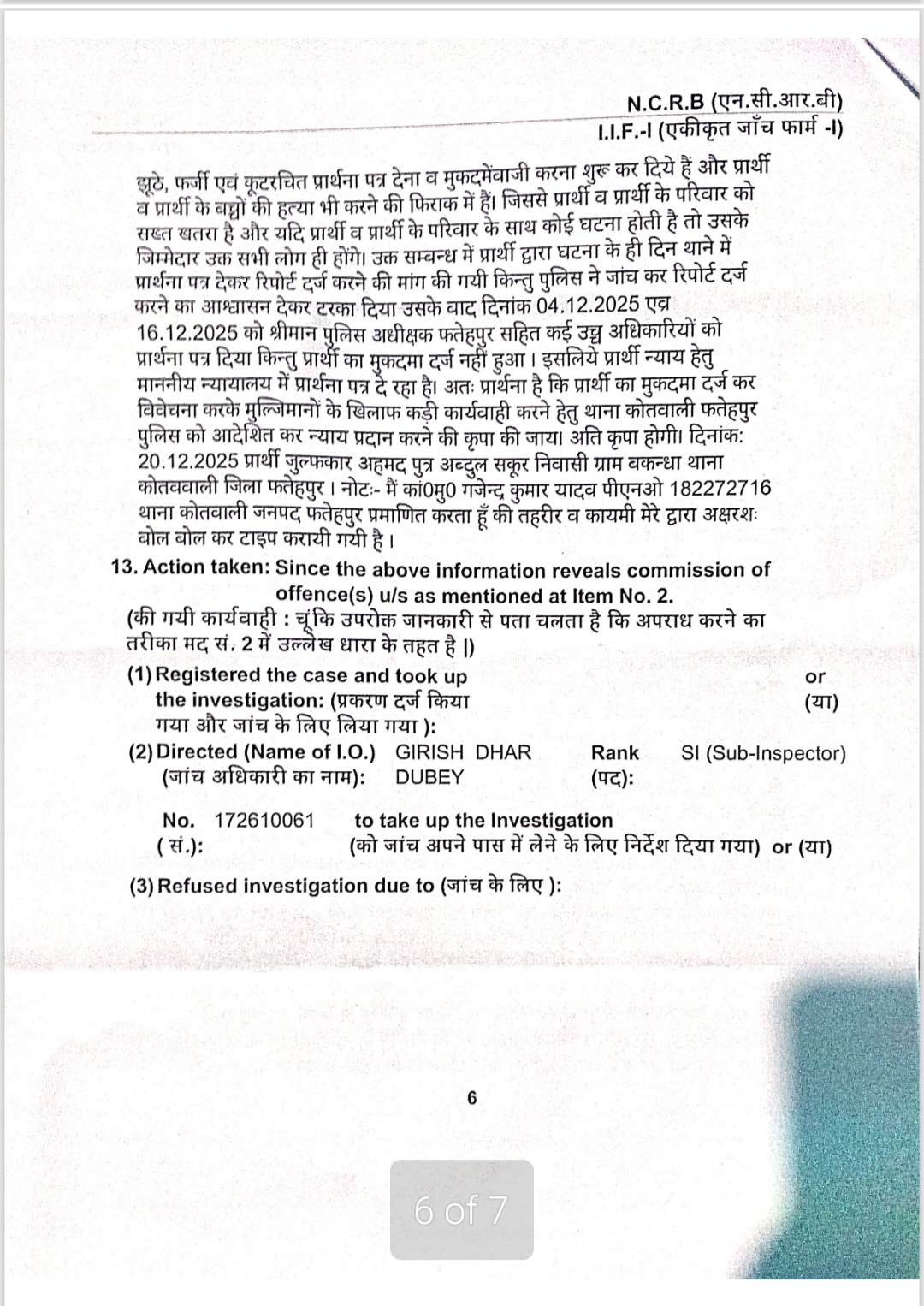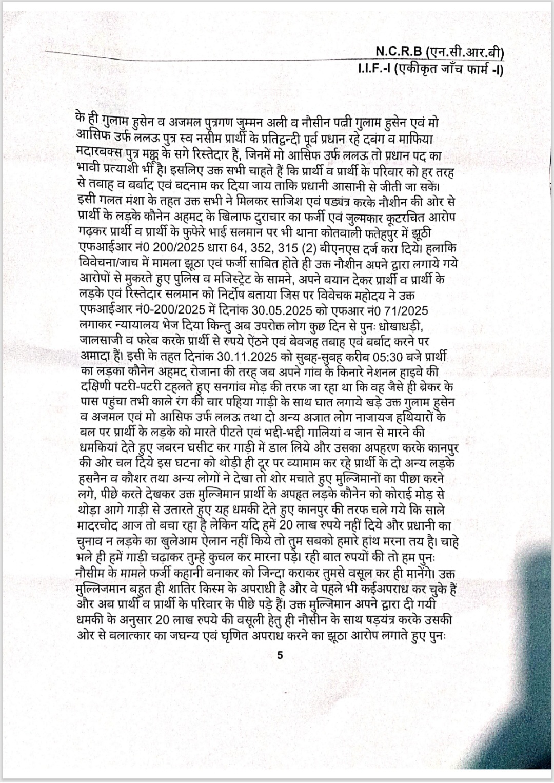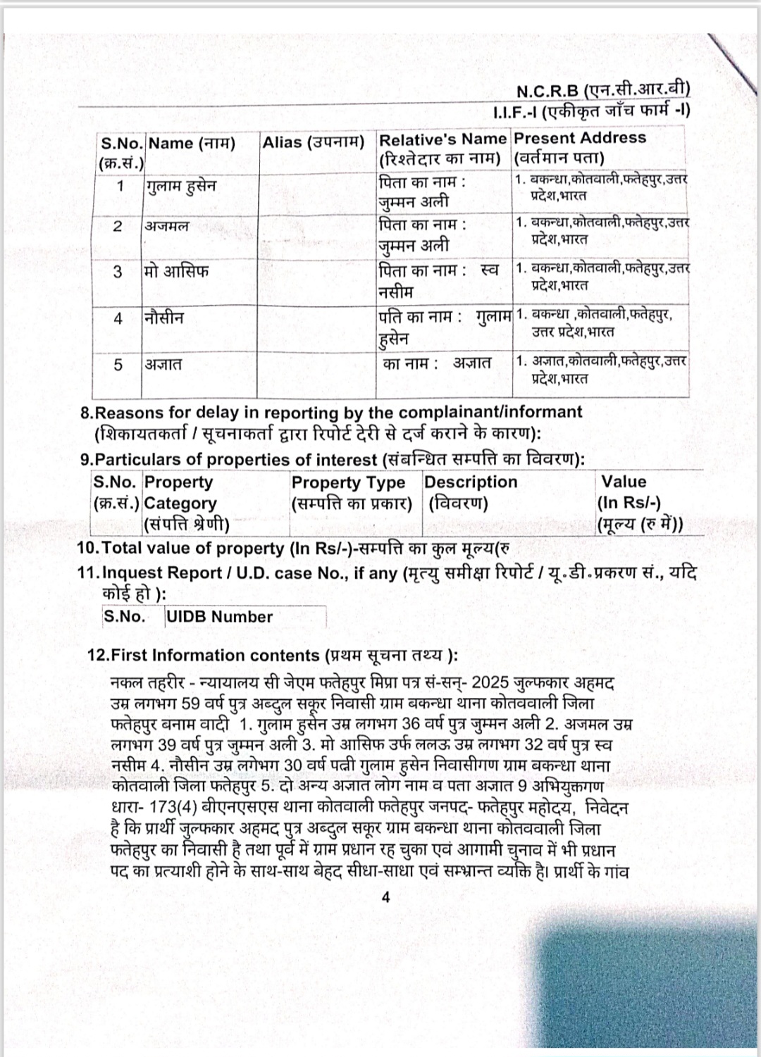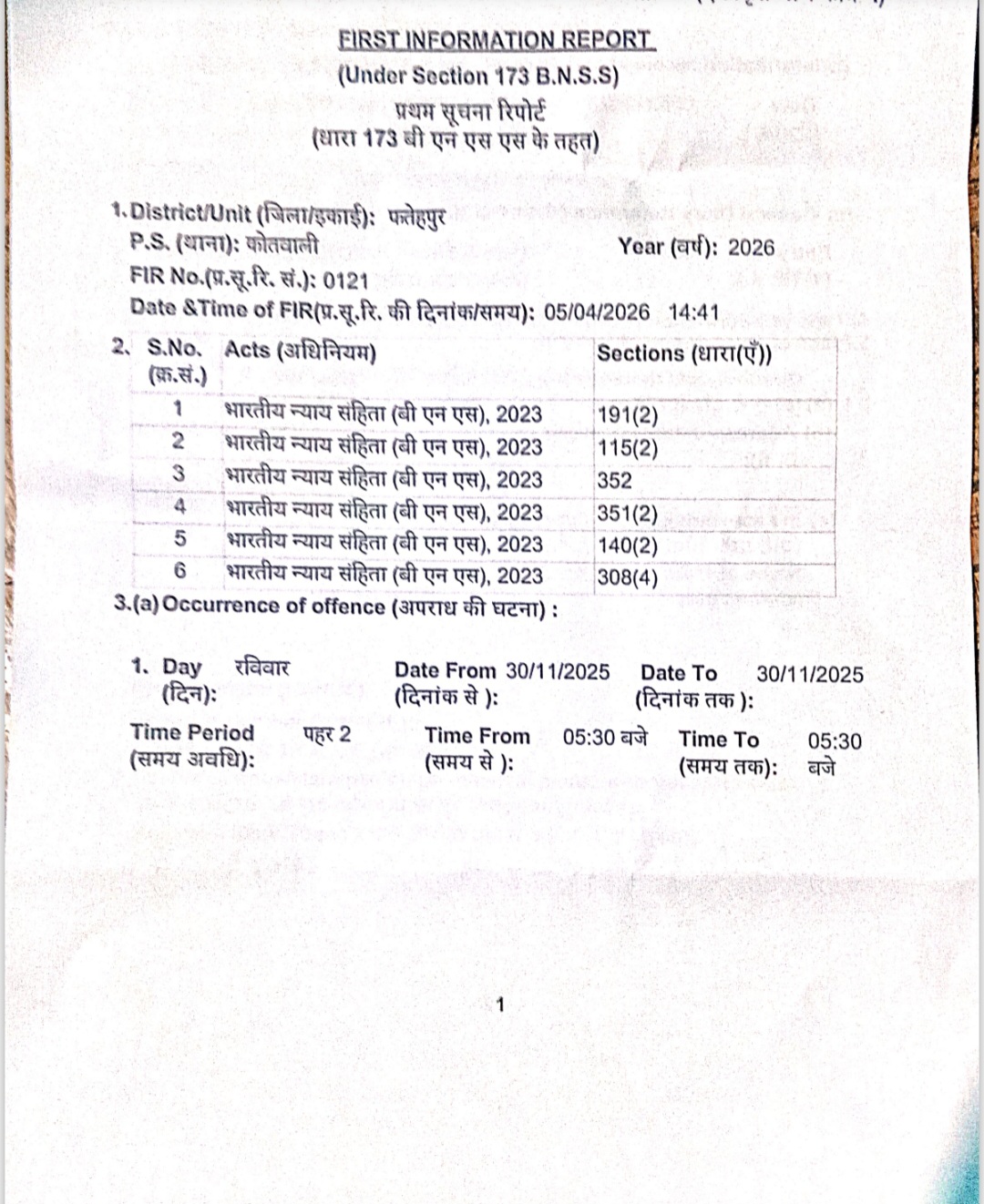 प्राप्त जानकारी के अनुसार कोतवाली फतेहपुर में FIR संख्या 0121/2026 दिनांक 05 अप्रैल 2026 को दर्ज की गई है। मुकदमा भारतीय न्याय संहिता की गंभीर धाराओं 191(2), 115(2), 352, 351(2), 140(2) एवं 308(4) के तहत पंजीकृत किया गया है।
