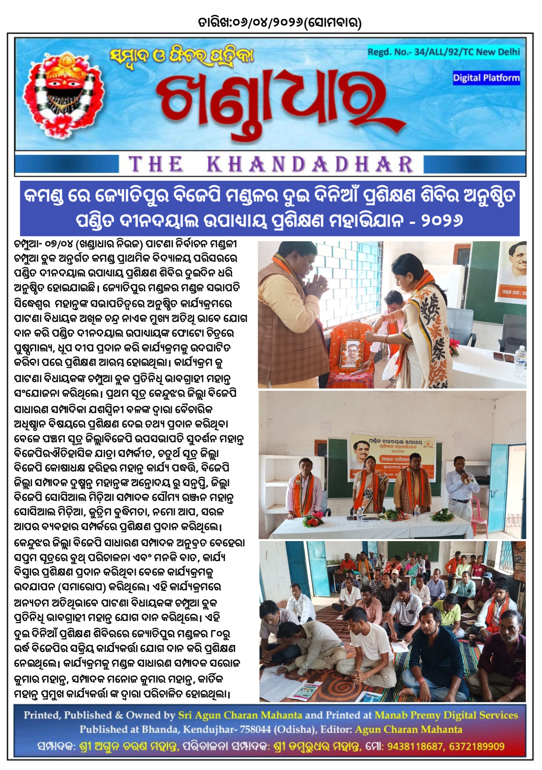 ଚମ୍ପୁଆ- ୦୭/୦୪(ଖଣ୍ଡାଧାର ନିଉଜ ) ପାଟଣା ନିର୍ବାଚନ ମଣ୍ଡଳୀ ଚମ୍ପୁଆ ବ୍ଲକ ଅନ୍ତର୍ଗତ କମଣ୍ଡ ପ୍ରାଥମିକ ବିଦ୍ୟାଳୟ ପରିସରରେ ପଣ୍ଡିତ ଦୀନଦୟାଲ ଉପାଧ୍ୟାୟ ପ୍ରଶିକ୍ଷଣ ଶିବିର ଦୁଇଦିନ ଧରି ଅନୁଷ୍ଠିତ ହୋଇଯାଇଛି। ଜ୍ୟୋତିପୁର ମଣ୍ଡଳର ମଣ୍ଡଳ ସଭାପତି ସିଦ୍ଧେଶ୍ୱର ମହାନ୍ତଙ୍କ ସଭାପତିତ୍ୱରେ ଅନୁଷ୍ଠିତ କାର୍ଯ୍ୟକ୍ରମରେ ପାଟଣା ବିଧାୟକ ଅଖିଳ ଚନ୍ଦ୍ର ନାଏକ ମୁଖ୍ୟ ଅତିଥି ଭାବେ ଯୋଗ ଦାନ କରି ପଣ୍ଡିତ ଦୀନଦୟାଲ ଉପାଧ୍ୟାୟଙ୍କ ଫୋଟୋ ଚିତ୍ରରେ ପୁଷ୍ପମାଲ୍ୟ, ଧୂପ ଦୀପ ପ୍ରଦାନ କରି କାର୍ଯ୍ୟକ୍ରମକୁ ଉଦଘାଟିତ କରିବା ପରେ ପ୍ରଶିକ୍ଷଣ ଆରମ୍ଭ ହୋଇଥିଲା। କାର୍ଯ୍ୟକ୍ରମ କୁ ପାଟଣା ବିଧାୟକଙ୍କ ଚମ୍ପୁଆ ବ୍ଲକ ପ୍ରତିନିଧି ଭାବଗ୍ରାହୀ ମହାନ୍ତ ସଂଯୋଜନା କରିଥିଲେ l ପ୍ରଥମ ସୂତ୍ର କେନ୍ଦୁଝର ଜିଲ୍ଲା ବିଜେପି ସାଧାରଣ ସମ୍ପାଦିକା ଯଶସ୍ବିନୀ ବଳଙ୍କ ଦ୍ଵାରା ବୈଚାରିକ ଅଧିଷ୍ଠାନ ବିଷୟରେ ପ୍ରଶିକ୍ଷଣ ଦେଇ ତଥ୍ୟ ପ୍ରଦାନ କରିଥିବା ବେଳେ ପଞ୍ଚମ ସୂତ୍ର ଜିଲ୍ଲାବିଜେପି ଉପସଭାପତି ସୁଦର୍ଶନ ମହାନ୍ତ ବିଜେପିରଐତିହାସିକ ଯାତ୍ରା ସମ୍ପର୍କୀତ, ଚତୁର୍ଥ ସୂତ୍ର ଜିଲ୍ଲା ବିଜେପି କୋଷାଧକ୍ଷ ହରିହର ମହାନ୍ତ କାର୍ଯ୍ୟ ପଦ୍ଧତ୍ତି, ବିଜେପି ଜିଲ୍ଲା ସମ୍ପାଦକ ଦୁଷ୍ମନ୍ତ ମହାନ୍ତଙ୍କ ଅନ୍ତୋଦୟ ରୁ ସନ୍ତପ୍ତି, ଜିଲ୍ଲା ବିଜେପି ସୋସିଆଲ ମିଡ଼ିଆ ସମ୍ପାଦକ ସୌମ୍ୟ ରଞ୍ଜନ ମହାନ୍ତ ସୋସିଆଲ ମିଡ଼ିଆ, କୁତ୍ରିମ ବୁଦ୍ଧିମତା, ନମୋ ଆପ, ସରଳ ଆପର ବ୍ୟବହାର ସମ୍ପର୍କରେ ପ୍ରଶିକ୍ଷଣ ପ୍ରଦାନ କରିଥିଲେ l କେନ୍ଦୁଝର ଜିଲ୍ଲା ବିଜେପି ସାଧାରଣ ସମ୍ପାଦକ ଅନୁବ୍ରତ ବେହେରା ସପ୍ତମ ସୂତ୍ରରେ ବୁଥ୍ ପରିଚାଳନା ଏବଂ ମନକି ବାତ, କାର୍ଯ୍ୟ ବିସ୍ତାର ପ୍ରଶିକ୍ଷଣ ପ୍ରଦାନ କରିଥିବା ବେଳେ କାର୍ଯ୍ୟକ୍ରମକୁ ଉଦଯାପନ (ସମାରୋପ) କରିଥିଲେ। ଏହି କାର୍ଯ୍ୟକ୍ରମରେ ଅନ୍ୟତମ ଅତିଥିଭାବେ ପାଟଣା ବିଧାୟକଙ୍କ ଚମ୍ପୁଆ ବ୍ଲକ ପ୍ରତିନିଧି ଭାବଗ୍ରାହୀ ମହାନ୍ତ ଯୋଗ ଦାନ କରିଥିଲେ। ଏହି ଦୁଇ ଦିନିଆଁ ପ୍ରଶିକ୍ଷଣ ଶିବିରରେ ଜ୍ୟୋତିପୁର ମଣ୍ଡଳର ୮0ରୁ ଉର୍ଦ୍ଧ ବିଜେପିର ସକ୍ରିୟ କାର୍ଯ୍ୟକର୍ତ୍ତା ଯୋଗ ଦାନ କରି ପ୍ରଶିକ୍ଷଣ ନେଇଥିଲେ।