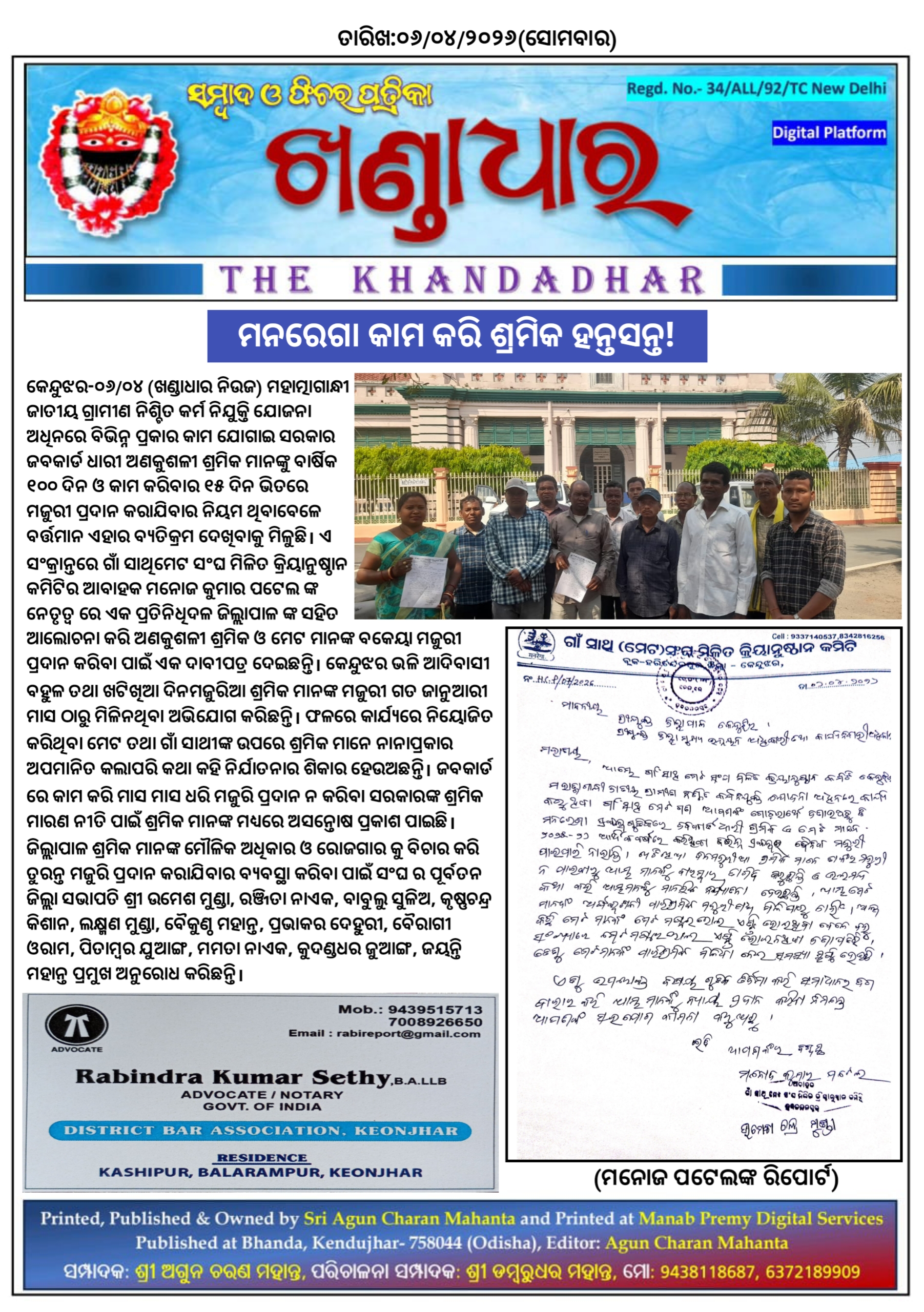 କେନ୍ଦୁଝର-୦୬/୦୪ (ଖଣ୍ଡାଧାର ନିଉଜ) ମହାତ୍ମାଗାନ୍ଧୀ ଜାତୀୟ ଗ୍ରାମୀଣ ନିଶ୍ଚିତ କର୍ମ ନିଯୁକ୍ତି ଯୋଜନା ଅଧିନରେ ବିଭିନ୍ନ ପ୍ରକାର କାମ ଯୋଗାଇ ସରକାର ଜବକାର୍ଡ ଧାରୀ ଅଣକୁଶଳୀ ଶ୍ରମିକ ମାନଙ୍କୁ ବାର୍ଷିକ ୧୦୦ ଦିନ ଓ କାମ କରିବାର ୧୫ ଦିନ ଭିତରେ ମଜୁରୀ ପ୍ରଦାନ କରାଯିବାର ନିୟମ ଥିବାବେଳେ ବର୍ତ୍ତମାନ ଏହାର ବ୍ଯତିକ୍ରମ ଦେଖିବାକୁ ମିଳୁଛି। ଏ ସଂକ୍ରାନ୍ତରେ ଗାଁ ସାଥିମେଟ ସଂଘ ମିଳିତ କ୍ରିୟାନୁଷ୍ଠାନ କମିଟିର ଆବାହକ ମନୋଜ କୁମାର ପଟେଲ ଙ୍କ ନେତୃତ୍ବ ରେ ଏକ ପ୍ରତିନିଧିଦଳ ଜିଲ୍ଲାପାଳ ଙ୍କ ସହିତ ଆଲୋଚନା କରି ଅଣକୁଶଳୀ ଶ୍ରମିକ ଓ ମେଟ ମାନଙ୍କ ବକେୟା ମଜୁରୀ ପ୍ରଦାନ କରିବା ପାଇଁ ଏକ ଦାବୀପତ୍ର ଦେଇଛନ୍ତି। କେନ୍ଦୁଝର ଭଳି ଆଦିବାସୀ ବହୁଳ ତଥା ଖଟିଖିଆ ଦିନମଜୁରିଆ ଶ୍ରମିକ ମାନଙ୍କ ମଜୁରୀ ଗତ ଜାନୁଆରୀ ମାସ ଠାରୁ ମିଳିନଥିବା ଅଭିଯୋଗ କରିଛନ୍ତି। ଫଳରେ କାର୍ଯ୍ଯରେ ନିୟୋଜିତ କରିଥିବା ମେଟ ତଥା ଗାଁ ସାଥୀଙ୍କ ଉପରେ ଶ୍ରମିକ ମାନେ ନାନାପ୍ରକାର ଅପମାନିତ କଲାପରି କଥା କହି ନିର୍ଯାତନାର ଶିକାର ହେଉଅଛନ୍ତି। ଜବକାର୍ଡ ରେ କାମ କରି ମାସ ମାସ ଧରି ମଜୁରି ପ୍ରଦାନ ନ କରିବା ସରକାରଙ୍କ ଶ୍ରମିକ ମାରଣ ନୀତି ପାଇଁ ଶ୍ରମିକ ମାନଙ୍କ ମଧ୍ଯରେ ଅସନ୍ତୋଷ ପ୍ରକାଶ ପାଇଛି। ଜିଲ୍ଲାପାଳ ଶ୍ରମିକ ମାନଙ୍କ ମୌଳିକ ଅଧିକାର ଓ ରୋଜଗାର କୁ ବିଚାର କରି ତୁରନ୍ତ ମଜୁରି ପ୍ରଦାନ କରାଯିବାର ବ୍ଯବସ୍ଥା କରିବା ପାଇଁ ସଂଘ ର ପୂର୍ବତନ ଜିଲ୍ଲା ସଭାପତି ଶ୍ରୀ ଉମେଶ ମୁଣ୍ଡା, ରଞ୍ଜିତା ନାଏକ, ବାବୁଲୁ ସୁଳିଅ, କୃଷ୍ଣଚନ୍ଦ୍ର କିଶାନ, ଲକ୍ଷ୍ମଣ ମୁଣ୍ଡା, ବୈକୁଣ୍ଠ ମହାନ୍ତ, ପ୍ରଭାକର ଦେହୁରୀ, ବୈରାଗୀ ଓରାମ, ପିତାମ୍ବର ଯୁଆଙ୍ଗ, ମମତା ନାଏକ, କୁଦଣ୍ଡଧର ଜୁଆଙ୍ଗ, ଜୟନ୍ତି ମହାନ୍ତ ପ୍ରମୁଖ ଅନୁରୋଧ କରିଛନ୍ତି।