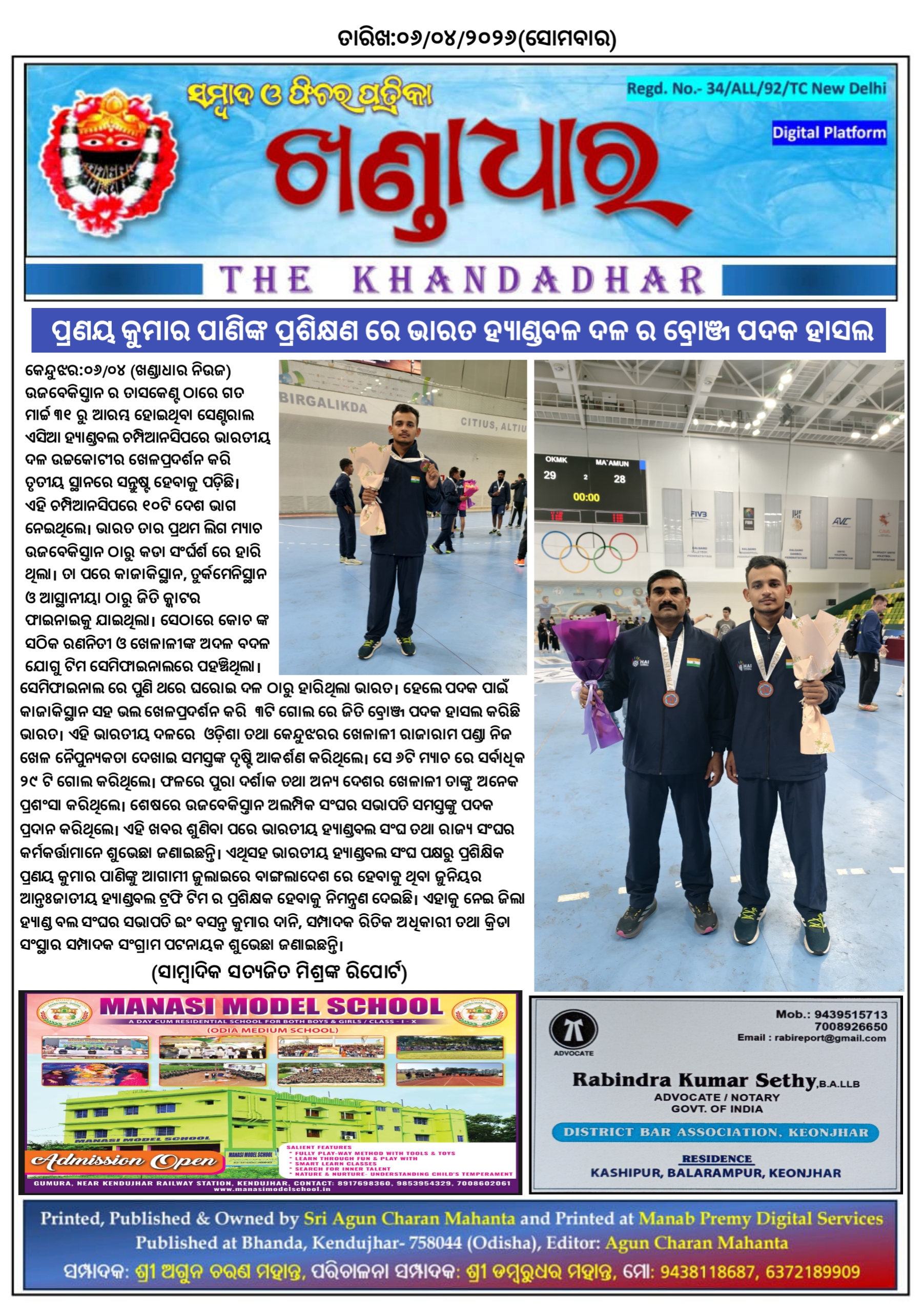 କେନ୍ଦୁଝର:୦୬/୦୪, ଉଜବେକିସ୍ତାନ ର ତାସକେଣ୍ଟ ଠାରେ ଗତ ମାର୍ଚ୍ଚ ୩୧ ରୁ ଆରମ୍ଭ ହୋଇଥିବା ସେଣ୍ଟରାଲ ଏସିଆ ହ୍ୟାଣ୍ଡବଲ ଚମ୍ପିଆନସିପରେ ଭାରତୀୟ ଦଳ ଉଚ୍ଚକୋଟୀର ଖେଳପ୍ରଦର୍ଶନ କରି ତୃତୀୟ ସ୍ଥାନରେ ସନ୍ତୁଷ୍ଟ ହେବାକୁ ପଡ଼ିଛି । ଏହି ଚମ୍ପିଆନସିପରେ ୧oଟି ଦେଶ ଭାଗ ନେଇଥିଲେ । ଭାରତ ତାର ପ୍ରଥମ ଲିଗ ମ୍ୟାଚ ଉଜବେକିସ୍ତାନ ଠାରୁ କଡା ସଂର୍ଘର୍ଶ ରେ ହାରି ଥିଲା । ତା ପରେ କାଜାକିସ୍ଥାନ, ତୁର୍କମେନିସ୍ଥାନ ଓ ଆସ୍ଥାନୀୟା ଠାରୁ ଜିତି କ୍କାଟର ଫାଇନାଇକୁ ଯାଇଥିଲା । ସେଠାରେ କୋଚ ଙ୍କ ସଠିକ ରଣନିତୀ ଓ ଖେଳାଳୀଙ୍କ ଅଦଳ ବଦଳ ଯୋଗୁ ଟିମ ସେମିଫାଇନାଲରେ ପହଞ୍ଚିଥିଲା । ସେମିଫାଇନାଲ ରେ ପୁଣି ଥରେ ଘରୋଇ ଦଳ ଠାରୁ ହାରିଥିଲା ଭାରତ । ହେଲେ ପଦକ ପାଇଁ କାଜାକିସ୍ଥାନ ସହ ଭଲ ଖେଳପ୍ରଦର୍ଶନ କରି ୩ଟି ଗୋଲ ରେ ଜିତି ବ୍ରୋଞ୍ଜ ପଦକ ହାସଲ କରିଛି ଭାରତ । ଏହି ଭାରତୀୟ ଦଳରେ ଓଡ଼ିଶା ତଥା କେନ୍ଦୁଝରର ଖେଳାଳୀ ରାଜାରାମ ପଣ୍ଡା ନିଜ ଖେଳ ନୈପୁନ୍ୟକତା ଦେଖାଇ ସମସ୍ତଙ୍କ ଦୃଷ୍ଟି ଆକର୍ଶଣ କରିଥିଲେ । ସେ ୬ଟି ମ୍ୟାଚ ରେ ସର୍ବାଧିକ ୨୯ ଟି ଗୋଲ କରିଥିଲେ । ଫଳରେ ପୁରା ଦର୍ଶାକ ତଥା ଅନ୍ୟ ଦେଶର ଖେଳାଳୀ ତାଙ୍କୁ ଅନେକ ପ୍ରଶଂସା କରିଥିଲେ । ଶେଷରେ ଉଜବେକିସ୍ତାନ ଅଲମ୍ପିକ ସଂଘର ସଭାପତି ସମସ୍ତଙ୍କୁ ପଦକ ପ୍ରଦାନ କରିଥିଲେ । ଏହି ଖବର ଶୁଣିବା ପରେ ଭାରତୀୟ ହ୍ୟାଣ୍ଡବଲ ସଂଘ ତଥା ରାଜ୍ୟ ସଂଘର କର୍ମକର୍ତ୍ତାମାନେ ଶୁଭେଛା ଜଣାଇଛନ୍ତି । ଏଥିସହ ଭାରତୀୟ ହ୍ୟାଣ୍ଡବଲ ସଂଘ ପକ୍ଷରୁ ପ୍ରଶିକ୍ଷିକ ପ୍ରଣୟ କୁମାର ପାଣିଙ୍କୁ ଆଗାମୀ ଜୁଲାଇରେ ବାଙ୍ଗଲାଦେଶ ରେ ହେବାକୁ ଥିବା ଜୁନିୟର ଆନ୍ତଃଜାତୀୟ ହ୍ୟାଣ୍ଡବଲ ଟ୍ରଫି ଟିମ ର ପ୍ରଶିକ୍ଷକ ହେବାକୁ ନିମନ୍ତ୍ରଣ ଦେଇଛି । ଏହାକୁ ନେଇ ଜିଲା ହ୍ୟାଣ୍ଡ ବଲ ସଂଘର ସଭାପତି ଇଂ ବସନ୍ତ କୁମାର ଦାନି , ସମ୍ପାଦକ ରିତିକ ଅଧିକାରୀ ତଥା କ୍ରିଡା ସଂସ୍ଥାର ସମ୍ପାଦକ ସଂଗ୍ରାମ ପଟନାୟକ ଶୁଭେଛା ଜଣାଇଛନ୍ତି ।