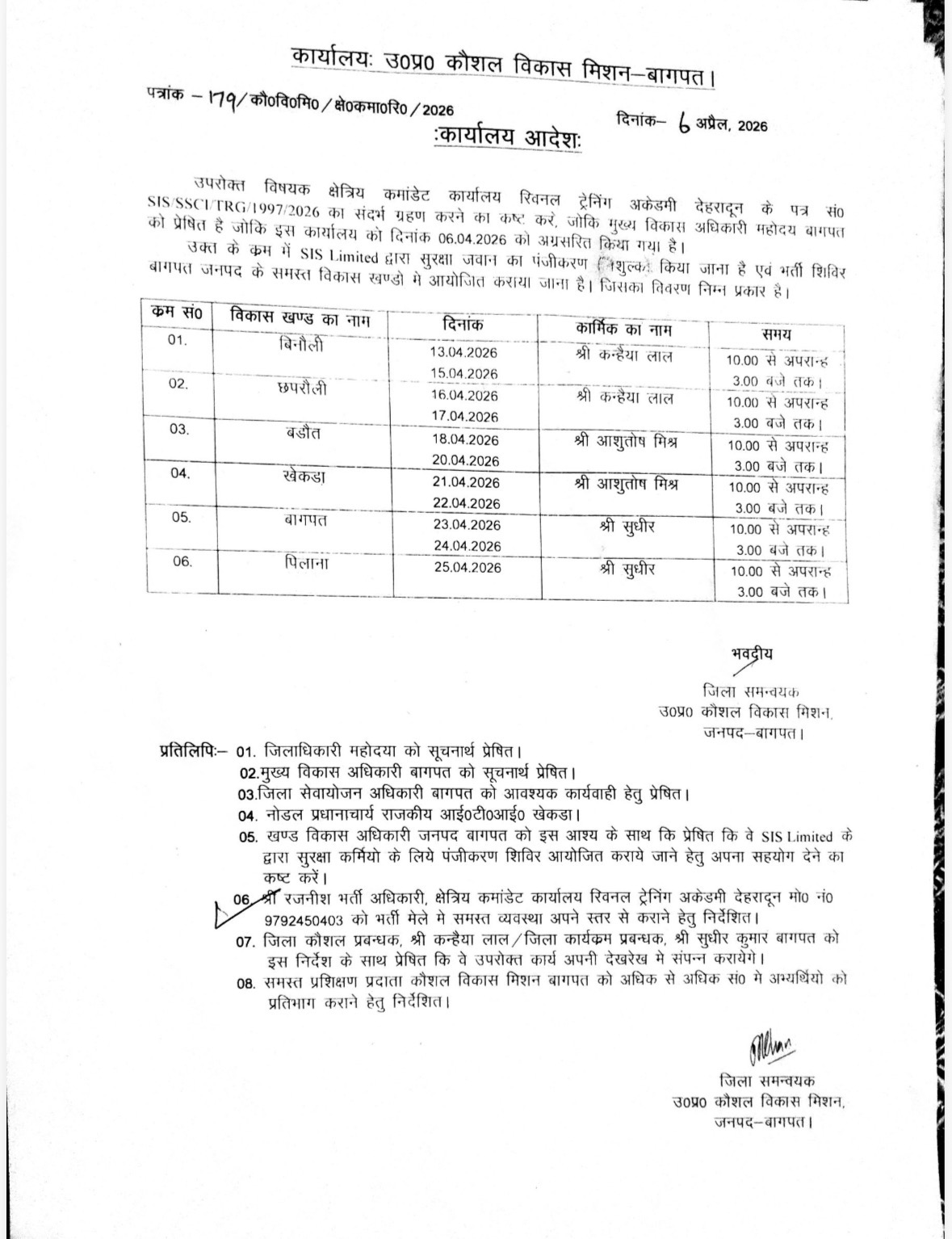 बागपत जनपद के सभी विकास खण्ड मुख्यालयों में भारतीय सुरक्षा दक्षता परिषद के सौजन्य से एस0आई 0एस0 इंडिया लि0 के संयुक्त तत्वाधान में बेरोजगार को रोजगार उपलब्ध कराने हेतु शिविर का आयोजन किया जाएगा जिसमें ग्रामीण व शहरी शिक्षित बेरोजगार अभ्यर्थियों को रोजगार प्रदान करने हेतु सिक्योरिटी स्किल काउंसिल ऑफ इंडिया लिमिटेड (एस0 आई0 एस0 ) जो एक बहुराष्ट्रीय कंपनी है जो भारत के अलावा विदेशों में भी सुरक्षा प्रदान करने का कार्य कर रही है इस शिविर में सुरक्षा सैनिक /सुरक्षा सुपरवाईजर/सुरक्षा अधिकारी की नियुक्ति की जाएगी।