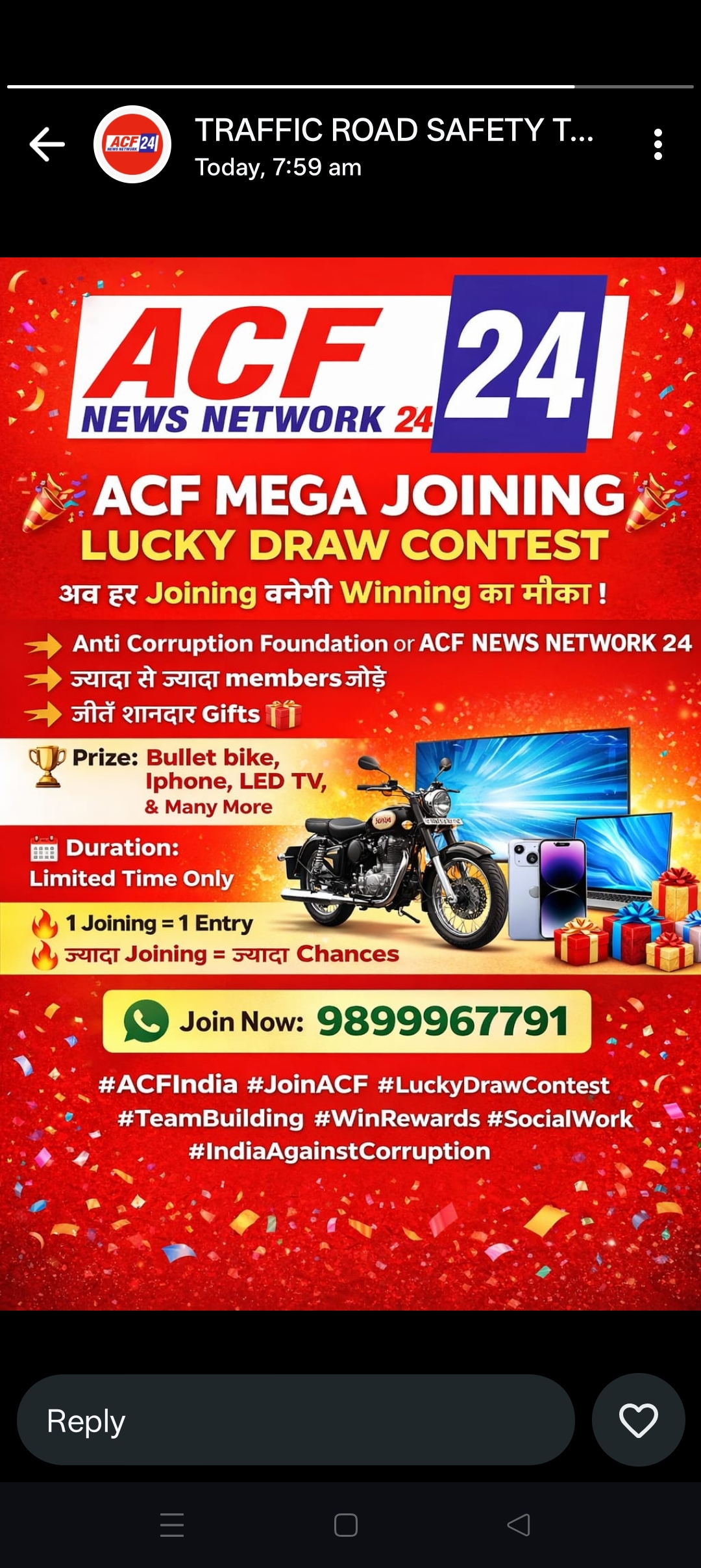 ACF 24 news joining starting and Anti currpution foundation and traffic welfare and roads safety. Different locations and different Post for all india. interested person, please contact,