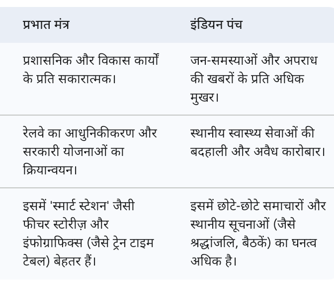 ​संक्षेप में: यदि हम प्रशासनिक प्रगति और रेलवे के अपडेट्स को गहराई से समझना चाहते हैं, तो प्रभात मंत्र बेहतर है। वहीं, यदि हम क्षेत्र की ज्वलंत समस्याओं (स्वास्थ्य, अपराध) और शैक्षणिक गतिविधियों के बारे में जानना चाहते हैं, तो इंडियन पंच अधिक प्रभावी ढंग से जानकारी देता है।