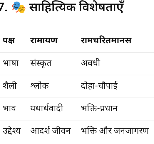 👉 वाल्मीकि ने यथार्थ और मानवीय पक्ष को दिखाया, जबकि तुलसीदास ने आध्यात्मिकता को प्रमुखता दी।