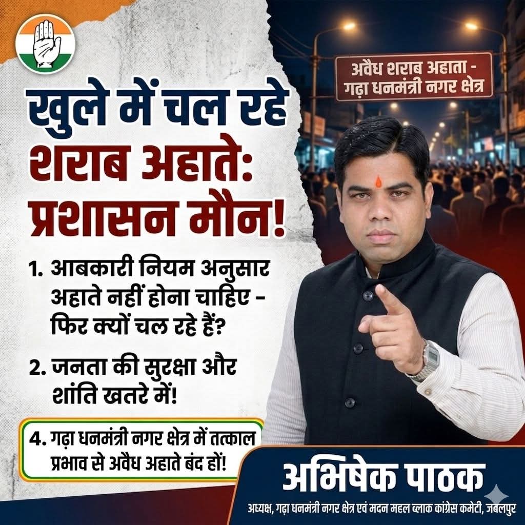 जबलपुर के गढ़ा धनवंतरी नगर क्षेत्र में आबकारी नियमों को ताक पर रखकर संचालित हो रहे अवैध अहातों के खिलाफ स्थानीय स्तर पर भारी आक्रोश देखा जा रहा है। कांग्रेस नेता अभिषेक पाठक ने इस मुद्दे को उठाते हुए प्रशासन की कार्यप्रणाली पर गंभीर सवाल खड़े किए हैं।