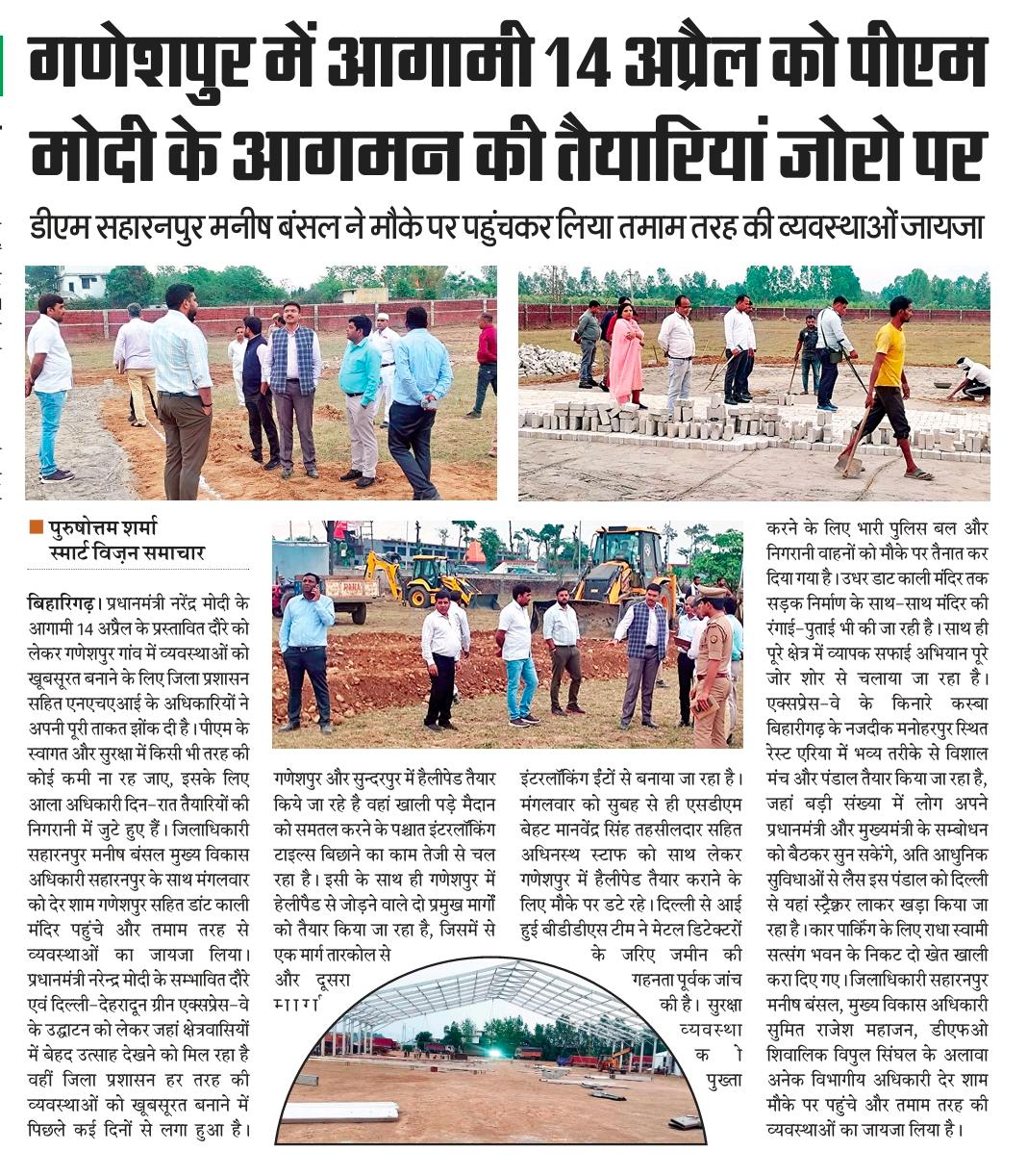 बिहारीगढ़ क्षेत्र के गणेशपुर में आगामी 14 अप्रैल को प्रधानमंत्री नरेंद्र मोदी के संभावित दौरे को लेकर तैयारियां जोरों पर हैं। जिला प्रशासन और अधिकारियों द्वारा मौके पर पहुंचकर व्यवस्थाओं का जायजा लिया जा रहा है।