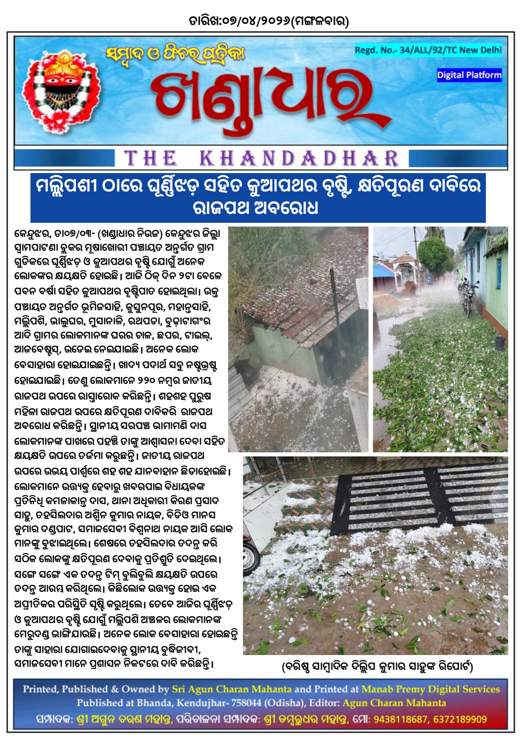 କେନ୍ଦୁଝର,ତା୭/୩- କେନ୍ଦୁଝର ଜିଲ୍ଲା ସ୍ଵାମପାଟଣା ବ୍ଲକର ମୂଷାଖୋରୀ ପଞ୍ଚାୟତ ଅନ୍ତର୍ଗତ ଗ୍ରାମ ଗୁଡିକରେ ଘୂର୍ଣ୍ଣିଝଡ଼ ଓ କୁଆପଥର ବୃଷ୍ଟି ଯୋଗୁଁ ଅନେକ ଲୋକଙ୍କର କ୍ଷୟକ୍ଷତି ହୋଇଛି। ଆଜି ଠିକ୍ ଦିନ ୨ଟା ବେଳେ ପବନ ବର୍ଷା ସହିତ କୁଆପଥର ବୃଷ୍ଟିପାତ ହୋଇଥିଲା। ଉକ୍ତ ପଞ୍ଚାୟତ ଅନ୍ତର୍ଗତ ଭୂମିଜସାହି,କୁସୁନପୂର,ମହାନ୍ତସାହି,ମଲ୍ଲିପଶି, ଭାଲୁଘର,ମୁସାନାଳି,ରଥପଡା,ବୁଢ଼ାଟାଗଂର ଆଦି ଗ୍ରାମର ଲୋକମାନଙ୍କ ଘରର ଚାଳ, ଛପର ,ଟାଇଲ୍, ଆଜବେଷ୍ଟସ୍, ଉଡେଇ ନେଇଯାଇଛି। ଅନେକ ଲୋକ ବେସାହାରା ହୋଇଯାଇଛନ୍ତି।ଖାଦ୍ୟ ପଦାର୍ଥ ସବୁ ନଷ୍ଟଭ୍ରଷ୍ଟ ହୋଇଯାଇଛି। ତେଣୁ ଲୋକମାନେ ୨୨୦ ନମ୍ବର ଜାତୀୟ ରାଜପଥ ଉପରେ ରାସ୍ତାରୋକ କରିଛନ୍ତି।ଶହଶହ ପୁରୁଷ ମହିଳା ରାଜପଥ ଉପରେ କ୍ଷତିପୂରଣ ଦାବିକରି ରାଜପଥ ଅବରୋଧ କରିଛନ୍ତି। ସ୍ଥାନୀୟ ସରପଞ୍ଚ ଭାମାମଣି ଦାସ ଲୋକମାନଙ୍କ ପାଖରେ ପହଞ୍ଚି ତାଙ୍କୁ ଆଶ୍ୱାସନା ଦେବା ସହିତ କ୍ଷୟକ୍ଷତି ଉପରେ ତର୍ଜମା କରୁଛନ୍ତି। ଜାତୀୟ ରାଜପଥ ଉପରେ ଉଭୟ ପାର୍ଶ୍ଵରେ ଶହ ଶହ ଯାନବାହାନ ଛିଡାହୋଇଛି। ଲୋକମାନେ ଉତ୍ତ୍ୟକ୍ତ ହେବାରୁ ଖବରପାଇ ବିଧାୟକଙ୍କ ପ୍ରତିନିଧି କମଳାକାନ୍ତ ଦାସ, ଥାନା ଅଧିକାରୀ କିରଣ ପ୍ରସାଦ ସାହୁ, ତହସିଲଦାର ଅଶ୍ୱିନ କୁମାର ନାୟକ, ବିଡିଓ ମାନସ କୁମାର ଦଣ୍ଡପାଟ,ସମାଜସେବୀ ବିଶ୍ୱନାଥ ନାୟକ ଆସି ଲୋକ ମାନଙ୍କୁ ବୁଝାଇଥିଲେ। ଶେଷରେ ତହସିଲଦାର ତଦନ୍ତ କରି ସଠିକ ଲୋକଙ୍କୁ କ୍ଷତିପୂରଣ ଦେବାକୁ ପ୍ରତିଶ୍ରୁତି ଦେଇଥିଲେ।ସଙ୍ଗେ ସଙ୍ଗେ ଏକ ତଦନ୍ତ ଟିମ୍ ବୁଲିବୁଲି କ୍ଷୟକ୍ଷତି ଉପରେ ତଦନ୍ତ ଆରମ୍ଭ କରିଥିଲେ। କିଛିଲୋକ ଉତ୍ତ୍ୟକ୍ତ ହୋଇ ଏକ ଅପ୍ରୀତିକର ପରିସ୍ଥିତି ସୃଷ୍ଟି କରୁଥିଲେ। ତେବେ ଆଜିର ଘୂର୍ଣ୍ଣିଝଡ଼ ଓ କୁଆପଥର ବୃଷ୍ଟି ଯୋଗୁଁ ମଲ୍ଲିପଶି ଅଞ୍ଚଳର ଲୋକମାନଙ୍କ ମେରୁଦଣ୍ଡ ଭାଙ୍ଗିଯାଉଛି। ଅନେକ ଲୋକ ବେସାହାରା ହୋଇଛନ୍ତି ତାଙ୍କୁ ସାହାରା ଯୋଗାଇଦେବାକୁ ସ୍ଥାନୀୟ ବୁଦ୍ଧିଜୀବୀ, ସମାଜସେବୀ ମାନେ ପ୍ରଶାସନ ନିକଟରେ ଦାବି କରିଛନ୍ତି।
