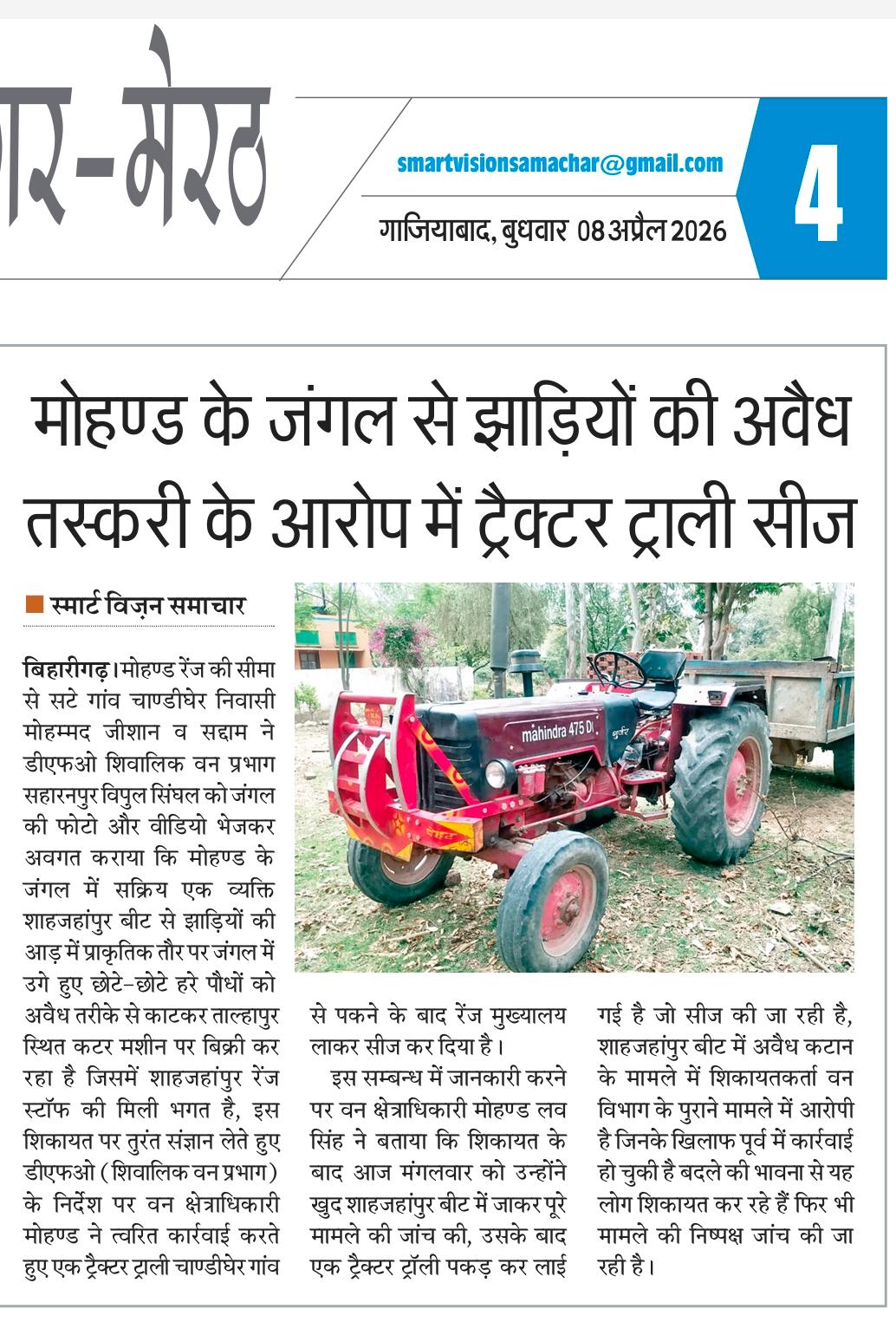 बिहारीगढ़ क्षेत्र के मोहंड जंगल से झाड़ियों की अवैध कटाई और तस्करी का मामला सामने आया है। शिकायत के बाद वन विभाग ने कार्रवाई करते हुए एक ट्रैक्टर ट्रॉली को सीज कर दिया है।
