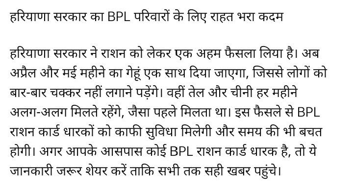 Is bar Haryana Sarkar ne 2 mahine ka ration Vitran karne ka Diya aadesh depo holder ko is bar April aur Mai mein sabhi BPL card darkon ko 2 mahine ka ration vitarit hoga