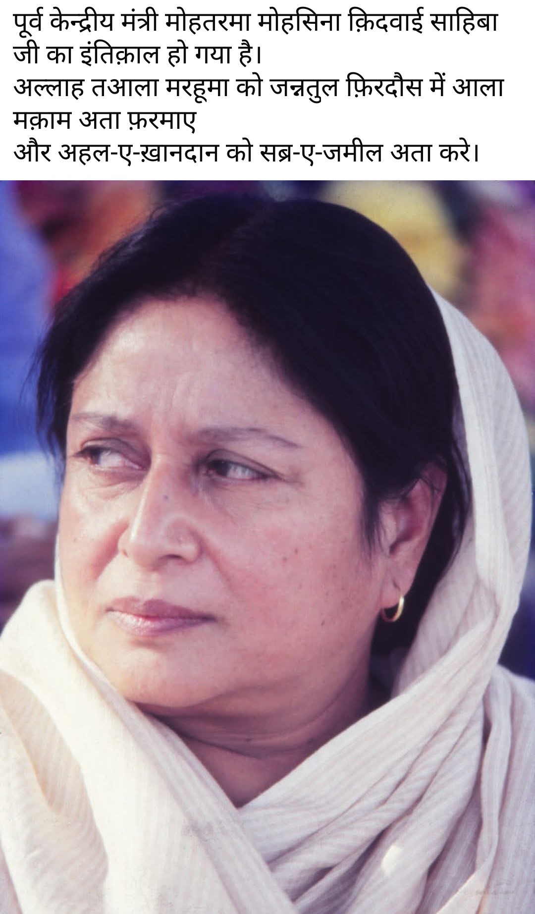 I'm Deeply saddened by the demise of former Union Minister for Urban and Rural Development, Health and Family Welfare and Transport, Govt of India, Mohtarma MOHSINA KIDWAI Saheba.