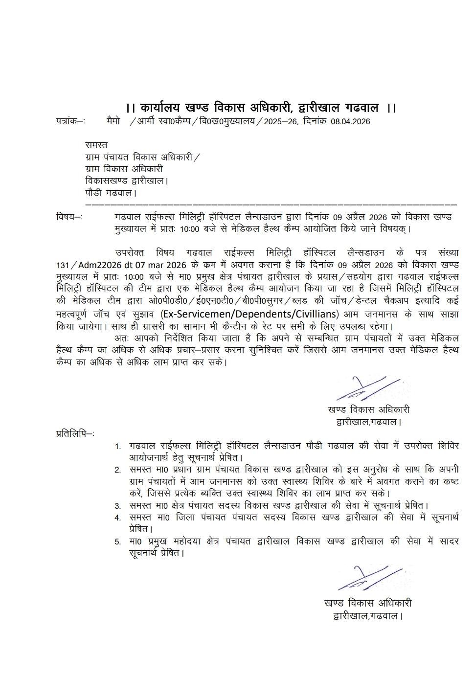 यह जानकारी खंड विकास अधिकारी, द्वारीखाल कार्यालय द्वारा जारी पत्र के माध्यम से दी गई है। पत्र के अनुसार, इस स्वास्थ्य शिविर में सैन्य अस्पताल की विशेषज्ञ मेडिकल टीम द्वारा क्षेत्रीय जनता को विभिन्न स्वास्थ्य सेवाएं प्रदान की जाएंगी।