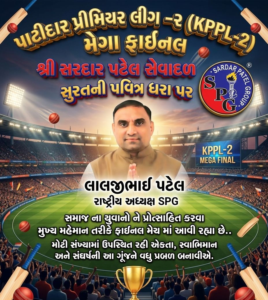 પાટીદાર સમાજમાં એકતા, સ્વાભિમાન અને યુવા શક્તિને પ્રોત્સાહન આપવાના હેતુથી આયોજિત “પાટીદાર પ્રીમિયર લીગ – 2” ની ભવ્ય મેગા ફાઇનલ તા. 12 એપ્રિલ 2026, રવિવારના રોજ રાત્રે 8:00 કલાકે ગાંધી મેદાન, ભીમરાડ રોડ, સુરત ખાતે યોજાનાર છે.