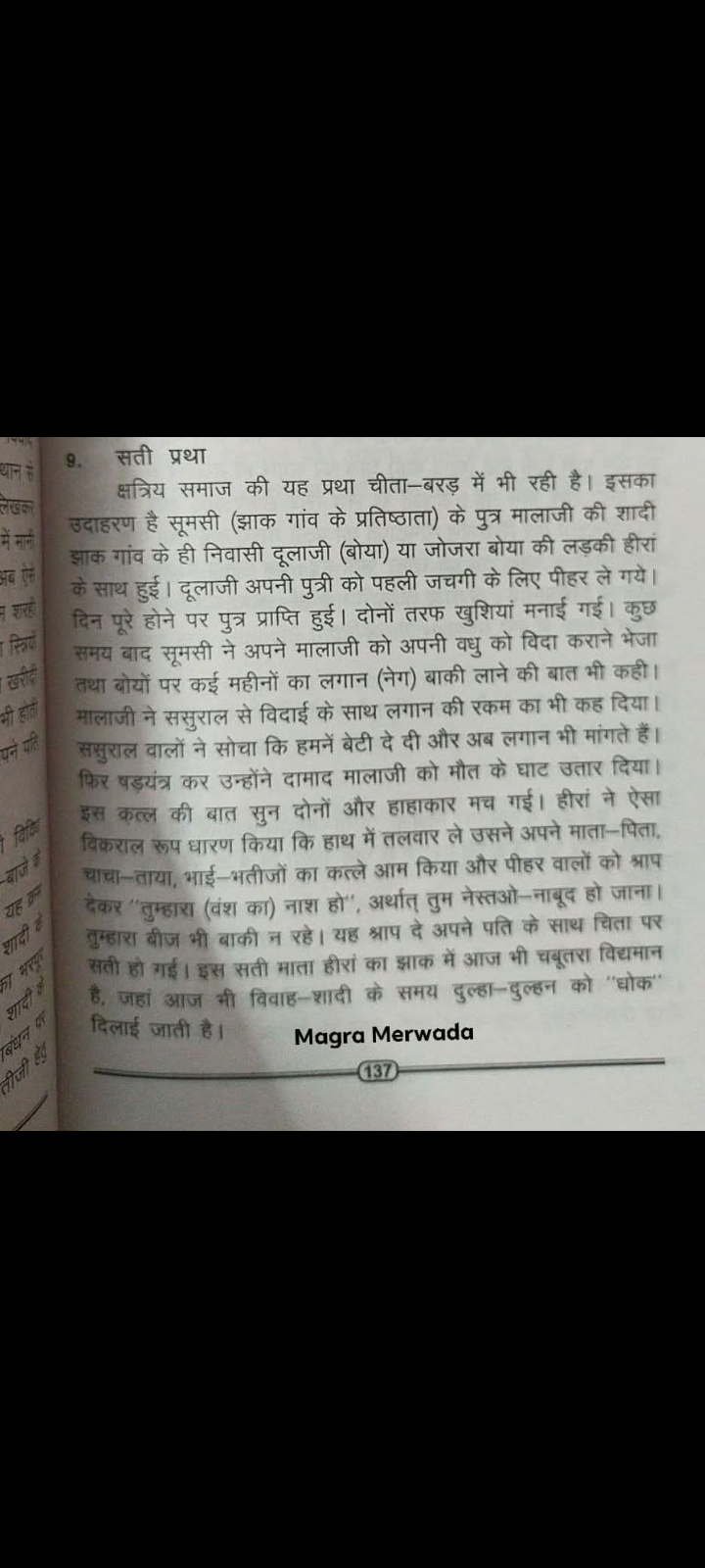 क्षत्रिय समाज की यह प्रथा चीता-बरड़ में भी रही है। इसका उदाहरण है सूमसी (झाक गांव के प्रतिष्ठाता) के पुत्र मालाजी की शादी झाक गांव के ही निवासी दूलाजी (बोया) या जोजरा बोया की लड़की हीरां के साथ हुई। दूलाजी अपनी पुत्री को पहली जचगी के लिए पीहर ले गये। दिन पूरे होने पर पुत्र प्राप्ति हुई। दोनों तरफ खुशियां मनाई गई। कुछ समय बाद सूमसी ने अपने मालाजी को अपनी वधु को विदा कराने भेजा तथा बोयों पर कई महीनों का लगान (नेग) बाकी लाने की बात भी कही। मालाजी ने ससुराल से विदाई के साथ लगान की रकम का भी कह दिया। ससुराल वालों ने सोचा कि हमनें बेटी दे दी और अब लगान भी मांगते हैं। फिर षड़यंत्र कर उन्होंने दामाद मालाजी को मौत के घाट उतार दिया। इस कत्ल की बात सुन दोनों और हाहाकार मच गई। हीरां ने ऐसा विकराल रूप धारण किया कि हाथ में तलवार ले उसने अपने माता-पिता,चाचा-ताया, भाई-भतीजों का कत्ले आम किया और पीहर वालों को श्राप देकर "तुम्हारा (वंश का) नाश हो", अर्थात् तुम नेस्तओ-नाबूद हो जाना। तुम्हारा बीज भी बाकी न रहे। यह श्राप दे अपने पति के साथ चिता पर सती हो गई। इस सती माता हीरां का झाक में आज भी चबूतरा विद्यमान है, जहां आज भी विवाह-शादी के समय दुल्हा-दुल्हन को "धोक" दिलाई जाती है।