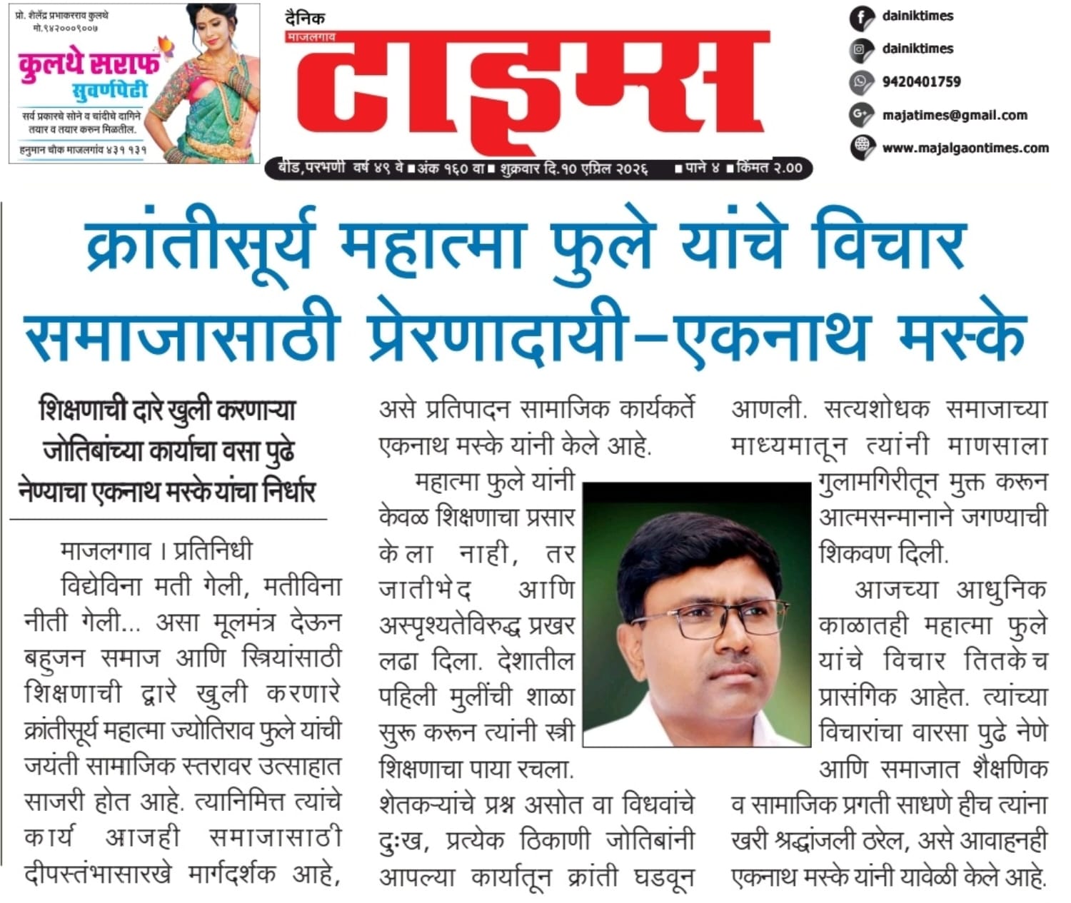 माजलगाव । प्रतिनिधी विद्येविना मती गेली, मतीविना नीती गेली... असा मूलमंत्र देऊन बहुजन समाज आणि स्त्रियांसाठी शिक्षणाची द्वारे खुली करणारे क्रांतीसूर्य महात्मा ज्योतिराव फुले यांची जयंती सामाजिक स्तरावर उत्साहात साजरी होत आहे. त्यानिमित्त त्यांचे कार्य आजही समाजासाठी दीपस्तंभासारखे मार्गदर्शक आहे,