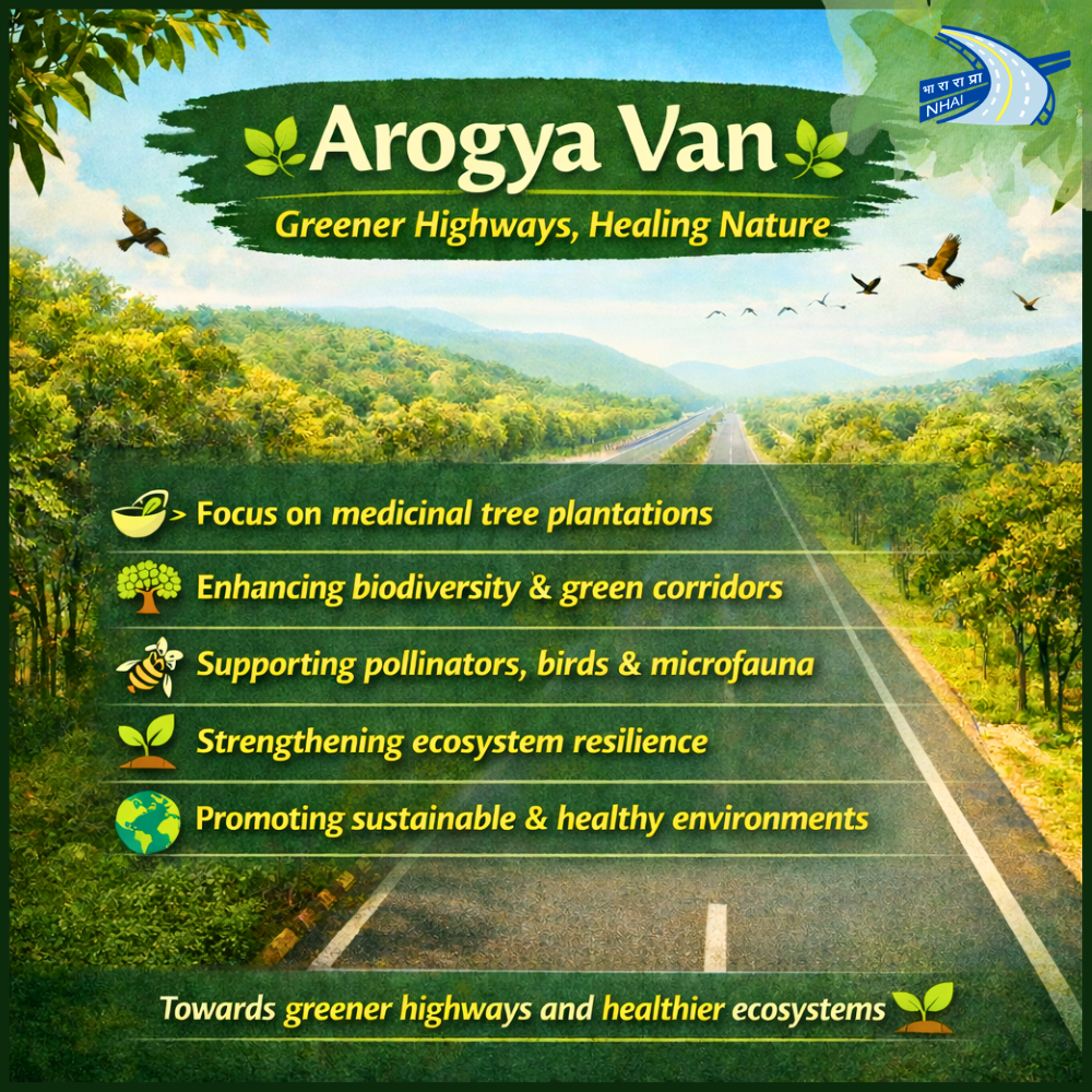 In a significant step towards enhancing biodiversity and promoting ecological sustainability in National Highway development, the National Highways Authority of India has initiated the development of ‘Arogya Van’, a thematic plantation of medicinal trees on vacant land parcels along National Highways. The initiative aims to enrich roadside ecosystems by introducing medicinal plant species that support pollinators, birds and microfauna, thereby strengthening ecological resilience.