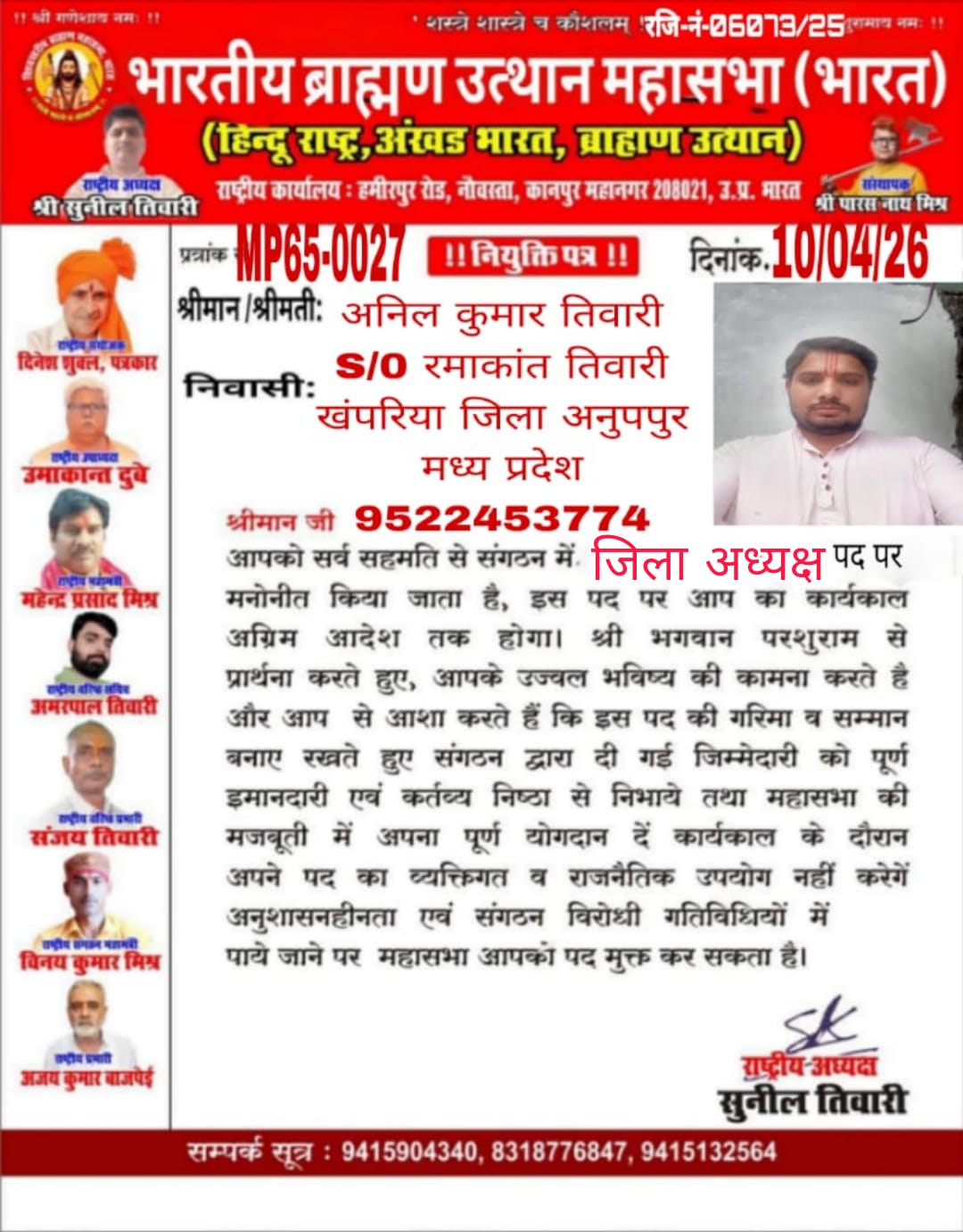 जिला अध्यक्ष – अनूपपुर नियुक्त किया गया है।