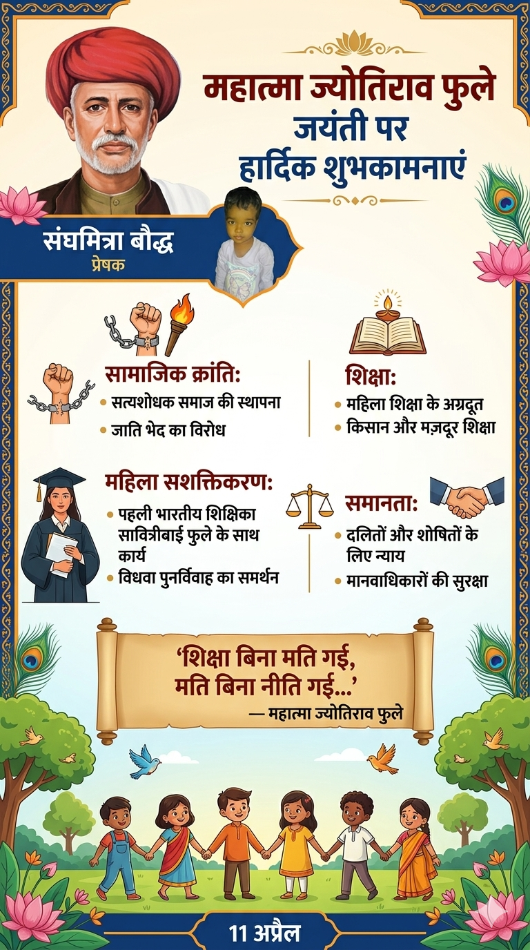 आज पूरे देश के साथ-साथ स्थानीय स्तर पर भी महान समाज सुधारक, विचारक और 'सत्यशोधक समाज' के संस्थापक महात्मा ज्योतिराव फुले की जयंती बड़े हर्षोल्लास के साथ मनाई जा रही है। इस अवसर पर विभिन्न सामाजिक संगठनों और प्रबुद्ध नागरिकों ने उन्हें याद कर पुष्पांजलि अर्पित की।