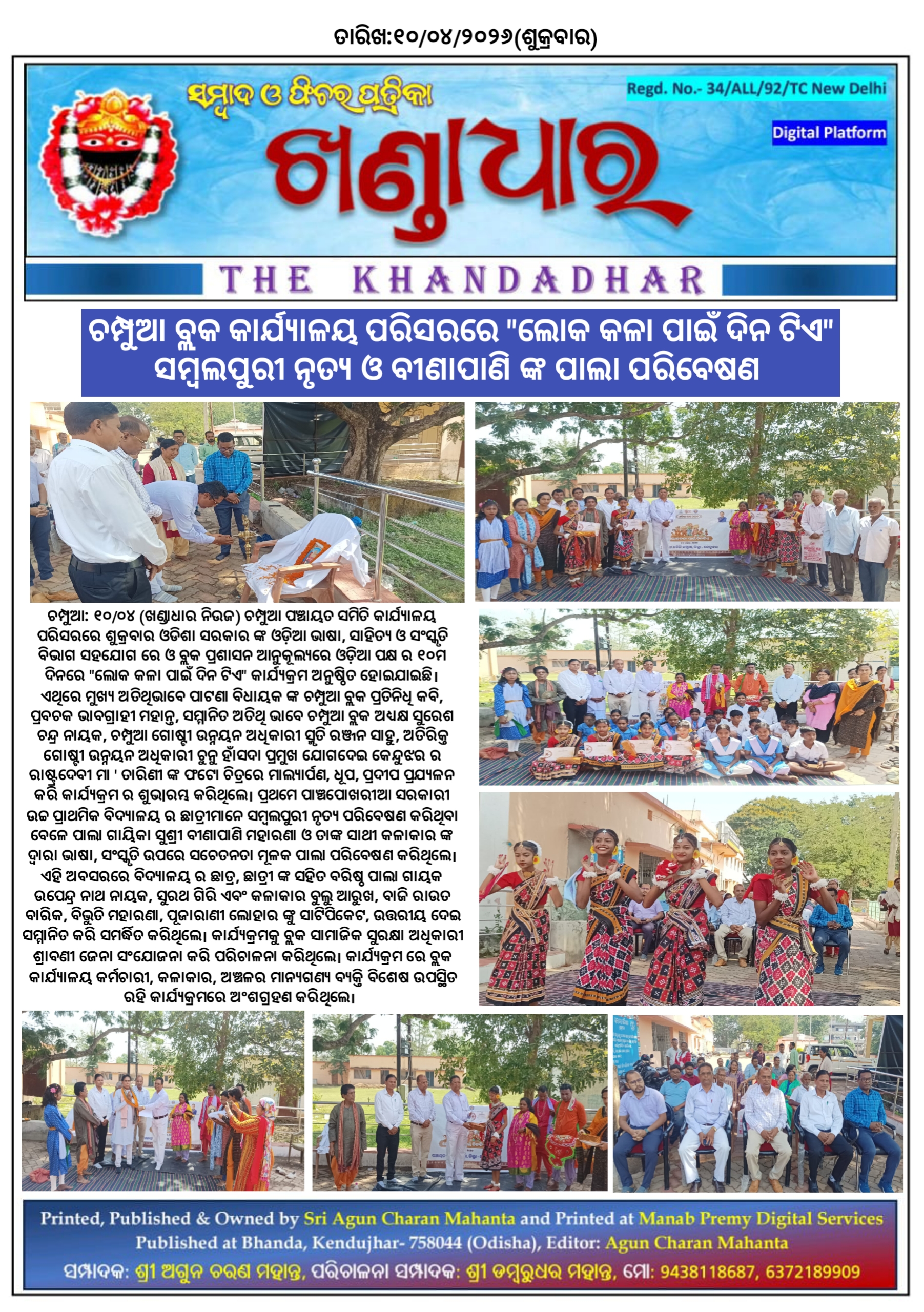 ଚମ୍ପୁଆ -୧୦/୦୪(ଖଣ୍ଡାଧାର ନିଉଜ) ଚମ୍ପୁଆ ପଞ୍ଚାୟତ ସମିତି କାର୍ଯ୍ୟାଳୟ ପରିସରରେ ଶୁକ୍ରବାର ଓଡିଶା ସରକାର ଙ୍କ ଓଡ଼ିଆ ଭାଷା, ସାହିତ୍ୟ ଓ ସଂସ୍କୃତି ବିଭାଗ ସହଯୋଗ ରେ ଓ ବ୍ଲକ ପ୍ରଶାସନ ଆନୁକୂଲ୍ୟରେ ଓଡ଼ିଆ ପକ୍ଷ ର ୧୦ମ ଦିନରେ "ଲୋକ କଳା ପାଇଁ ଦିନ ଟିଏ " କାର୍ଯ୍ୟକ୍ରମ ଅନୁଷ୍ଠିତ ହୋଇଯାଇଛି l